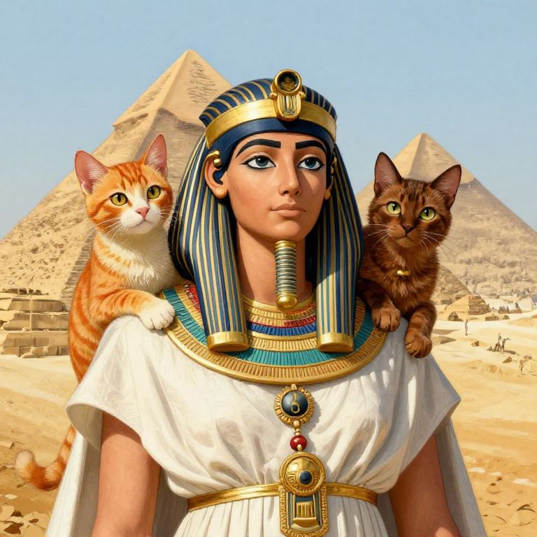 Artistic portrayal of Queen Cleopatra wearing traditional Egyptian royal attire with a striped blue and gold headdress and ornate jewelry. Two cats, one orange tabby on her left shoulder and one brown cat on her right, sit beside her. The iconic pyramids of Egypt are visible in the sandy background under a clear blue sky.