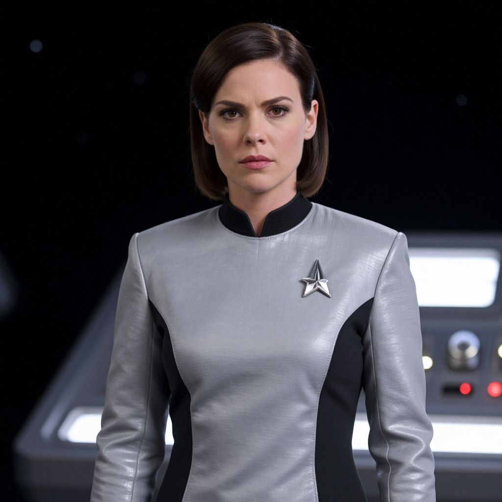Photograph of a serious-looking woman with short brown hair, wearing a silver and black Starfleet uniform with an insignia, against a dark, futuristic