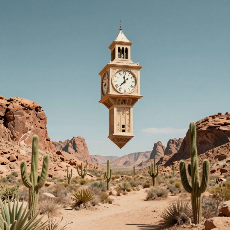 A surreal desert landscape is dominated by a massive, floating clock tower suspended mid-air, its presence defying gravity against a backdrop of rugged rock formations and scattered cacti, creating an otherworldly scene where time seems both omnipresent and intangible.