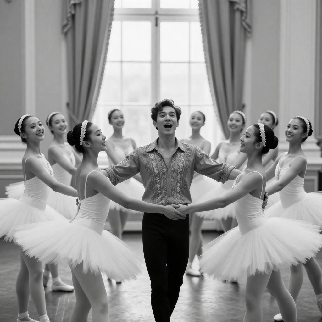 Black-and-white photograph of a group of women and one man in a dance scene. Man in center, dark hair, open mouth, ornate shirt, dark pants. Women in white, fluffy tutus, headbands, smiling, holding hands, dancing. Background: large window, decorative curtains. Man's expression: excited. Women's expressions: joyful. Group size: 11.