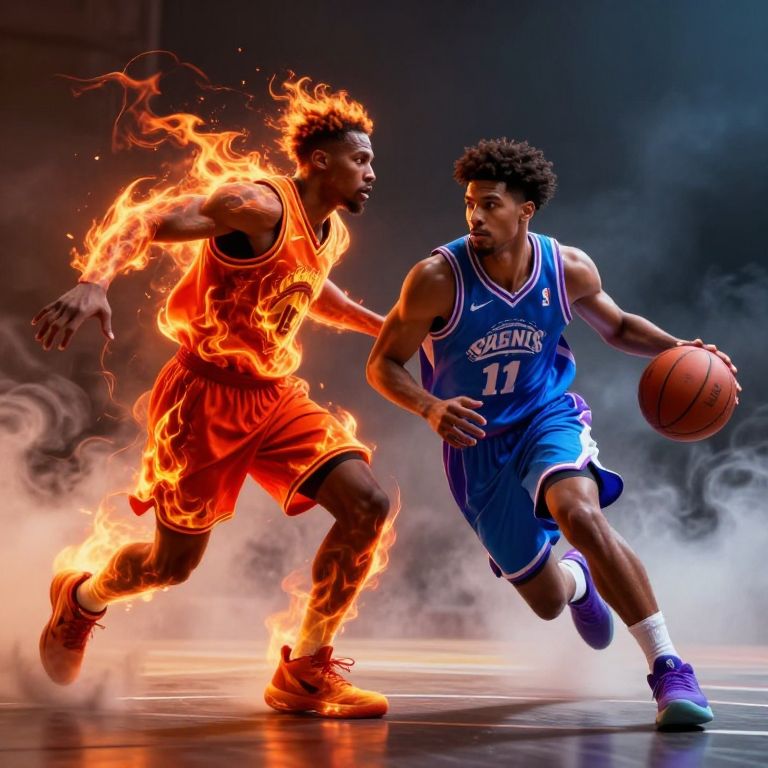 The image depicts a dynamic and vibrant fantasy NBA match, featuring two basketball players in mid-action. The player on the left is adorned in a fiery, orange and red outfit, exuding an intense and fiery aura, while the player on the right is dressed in a cool, blue and purple ensemble, radiating a calm and composed energy. Both players are captured in a powerful pose, with the player on the left seemingly in a defensive stance, his arms outstretched, and the player on the right in an offensive maneuver, dribbling the basketball with precision. The background is a dramatic blend of dark and light, with swirling clouds of smoke and light, enhancing the dramatic and intense atmosphere of the scene. The overall composition is balanced, with the two players facing each other, creating a sense of tension and competition. The interplay of colors, textures, and shapes adds depth and complexity to the image, making it a visually striking representation of a high-stakes basketball match.