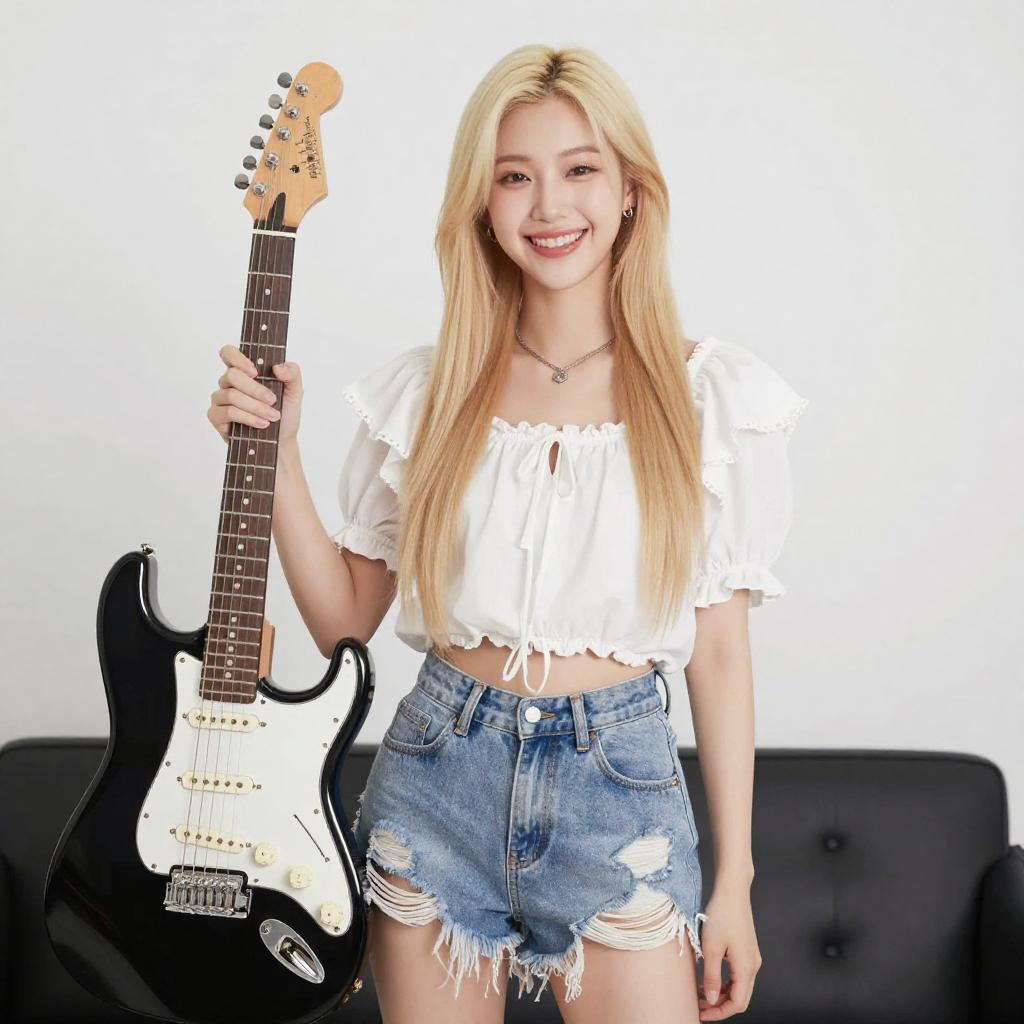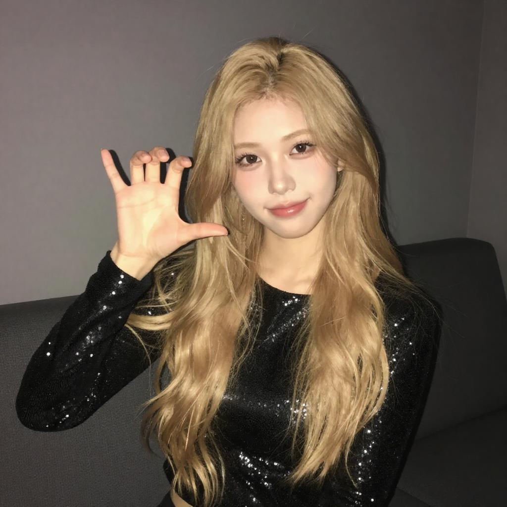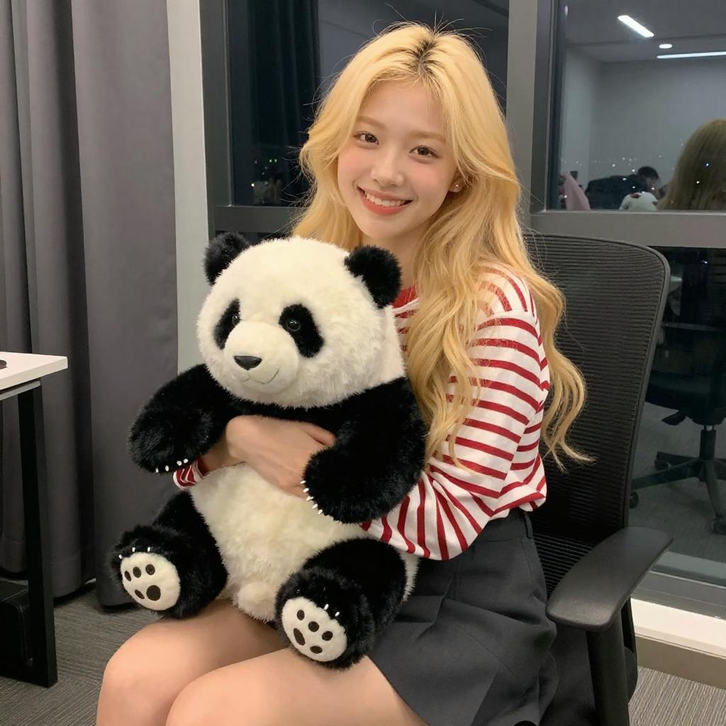 Photograph of a smiling young woman with long, wavy blonde hair, wearing a striped red and white long-sleeve shirt and black skirt. She sits in a black office chair, hugging a white and black panda plush toy. Background includes a dark curtain and a glass window reflecting indoor lights.