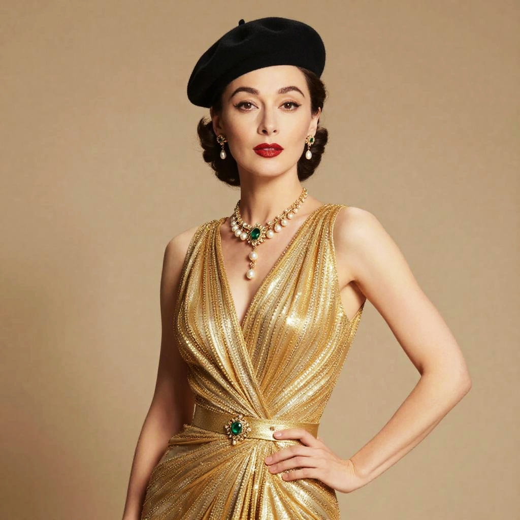 A woman exudes elegance and confidence in a shimmering gold dress, reminiscent of classic film star glamour. Her stylish beret and statement jewelry add a touch of vintage charm to the scene.