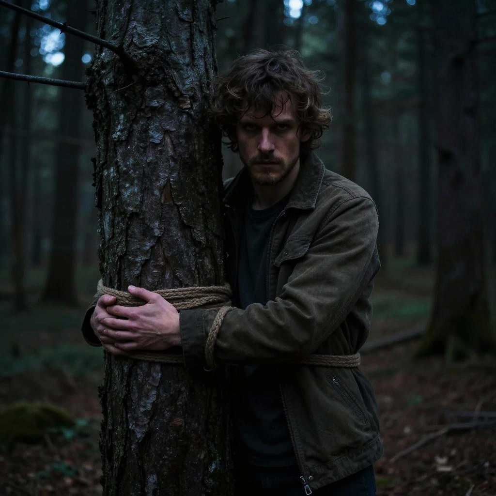 Man tied to tree in a dark forest at dusk, rugged clothing, intense expression, moody lighting, detailed bark texture, cinematic atmosphere --v 5 --ar 16:9