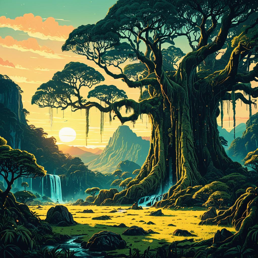 Illustration of a fantasy landscape at sunset, with gigantic ancient banyan trees illuminated with bioluminescent moss. Golden light on mountains, verdant valley with magical atmosphere, distant roaring waterfall, inspired by retro gaming aesthetics, cinematic and enchanting.