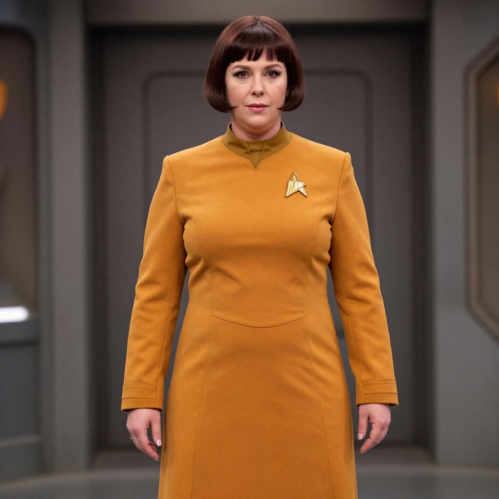 Photograph of a woman with a short bob haircut, wearing a long, mustard-yellow dress with a small white star emblem, standing in a futuristic,