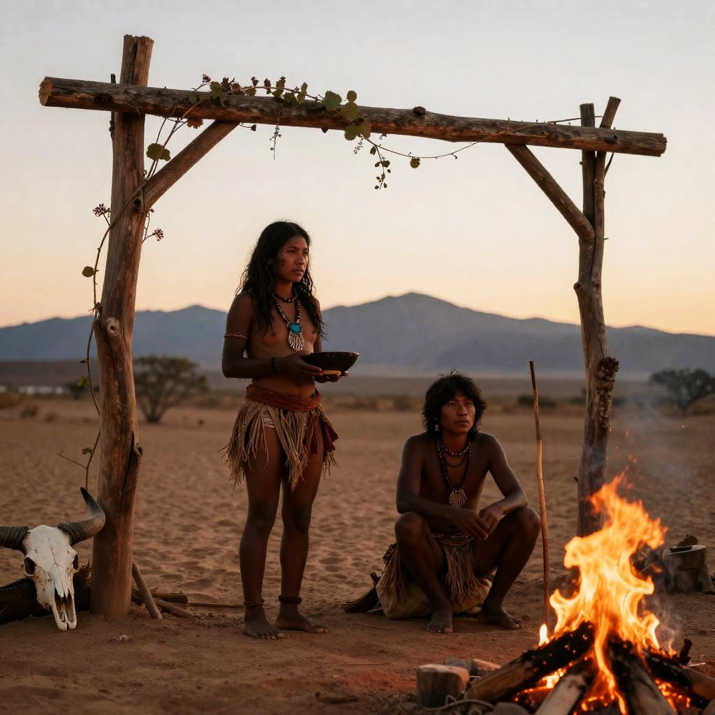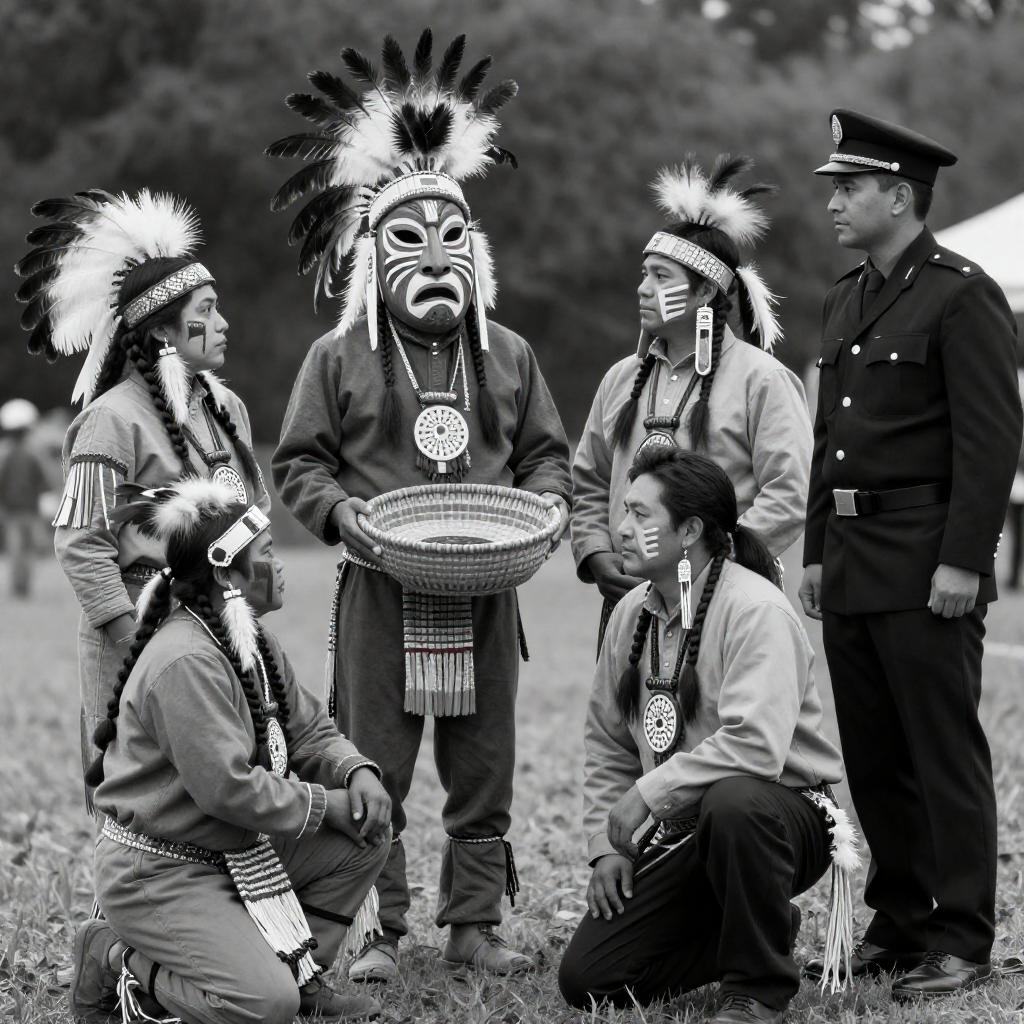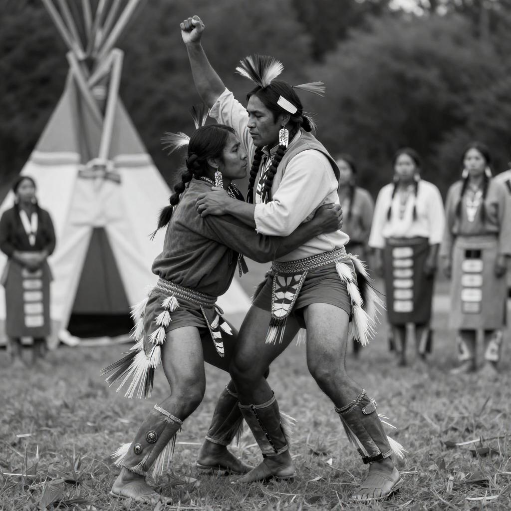 Black and white photograph. Two muscular, shirtless men with long hair and animal skin loincloths assemble wooden sticks. Large crowd of shirtless people with varied body sizes and skin tones in background. Several conical tents in distance. Men in foreground focused on task, men in background watching intently. Dry, grassy field.