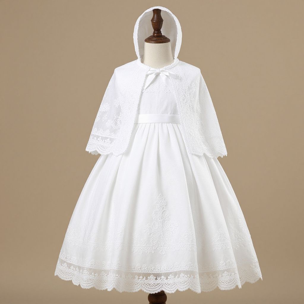 Photograph of a white, lace-trimmed, full-length dress with a hood, displayed on a wooden mannequin against a beige background.