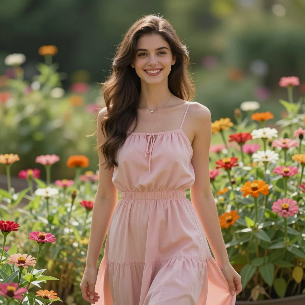 Sweet dress, photograph of a beautiful young woman, long brown hair, wearing a light pink sundress, standing in a vibrant garden, surrounded by colorful flowers, pink, orange, and white blooms, sunlight, green foliage, smiling, natural light, daytime, summer, soft focus background, bokeh effect, realistic, cute, attractive, feminine, casual, outdoor, cheerful atmosphere, floral garden, realistic ures