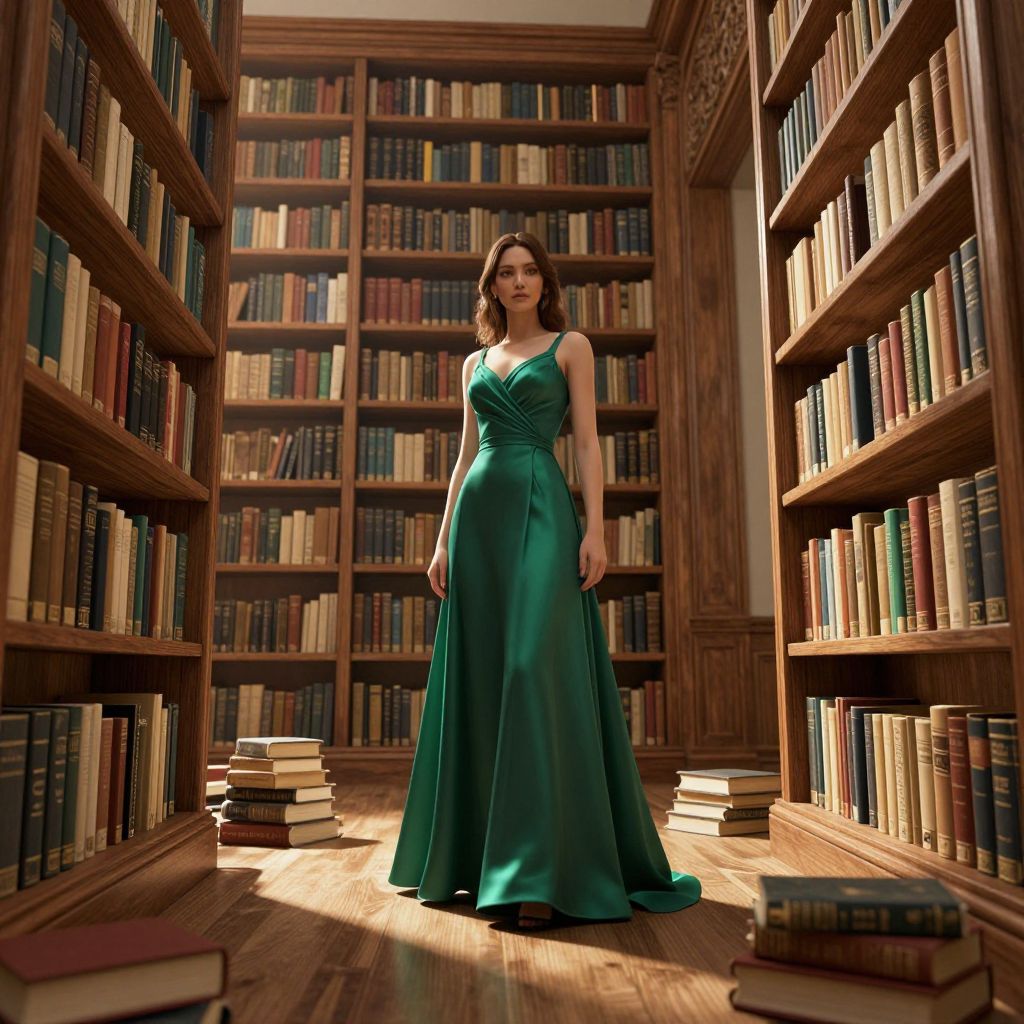 In a high-definition digital rendering, a woman in a flowing emerald gown stands amidst towering wooden bookshelves in a sunlit library, where scattered books on the floor hint at stories yet to be explored, evoking a sense of timeless mystery and alternate possibilities.