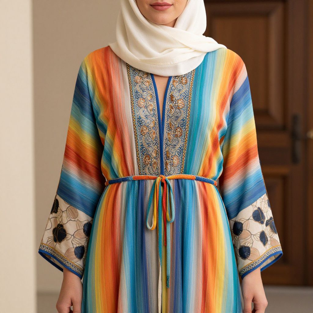 Photograph of a woman in a vibrant, rainbow-striped dress with blue and orange patterns, intricate embroidered sleeves, and a white hijab, standing in
