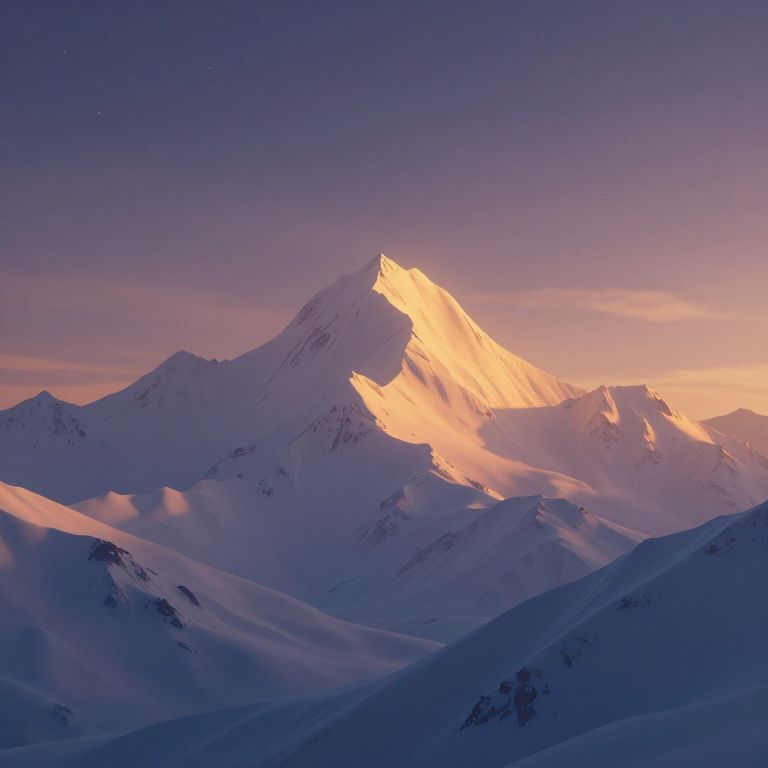 A serene 3D-rendered landscape captures snow-capped mountains bathed in the ethereal glow of golden hour, their peaks dissolving into soft silhouettes against a starry twilight sky, evoking a dreamlike, impressionistic quality.