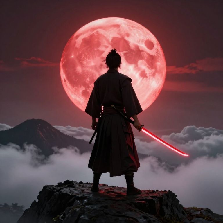 A samurai standing on a rocky cliff, He has his back turned to the viewer, and in the background you can see a huge red moon disk illuminating the stage, The samurai is dressed in traditional clothing, holding a katana with a bright glowing red blade in one hand, Clouds stretch around him, and in the distance you can see the dark silhouette of a mountain, An epic and dramatic atmosphere