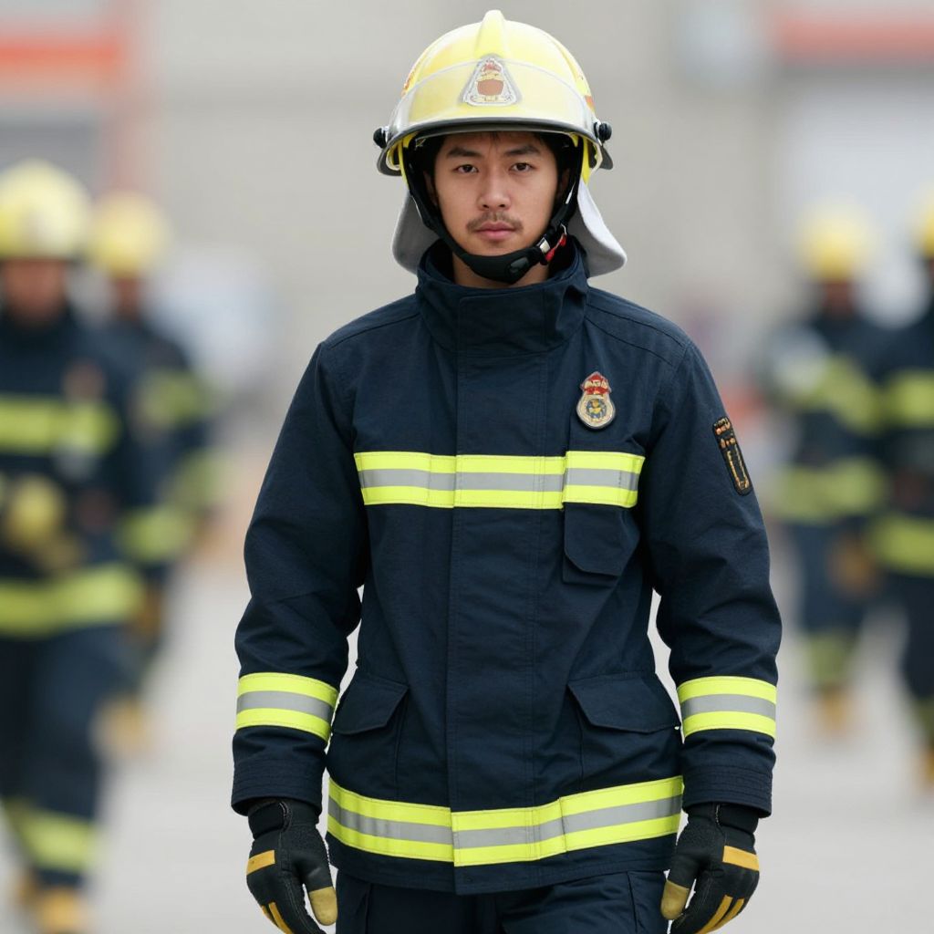 "man firefighter costume, 1boy, male focus, solo, helmet, facial hair, blurry background, looking at viewer, jacket, standing, gloves, blurry, hands in pockets, asian, pants, long sleeves Realistic photo of casual sexy person with pretty face"