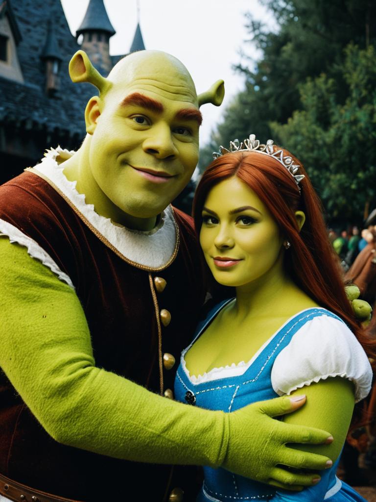 Couple in Shrek and Fiona Costumes, photorealistic fantasy cosplay portrait, cinematic realism