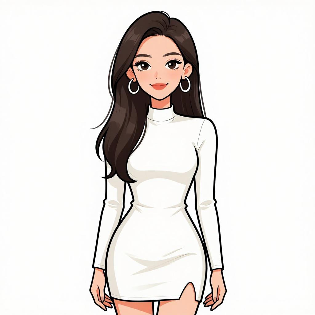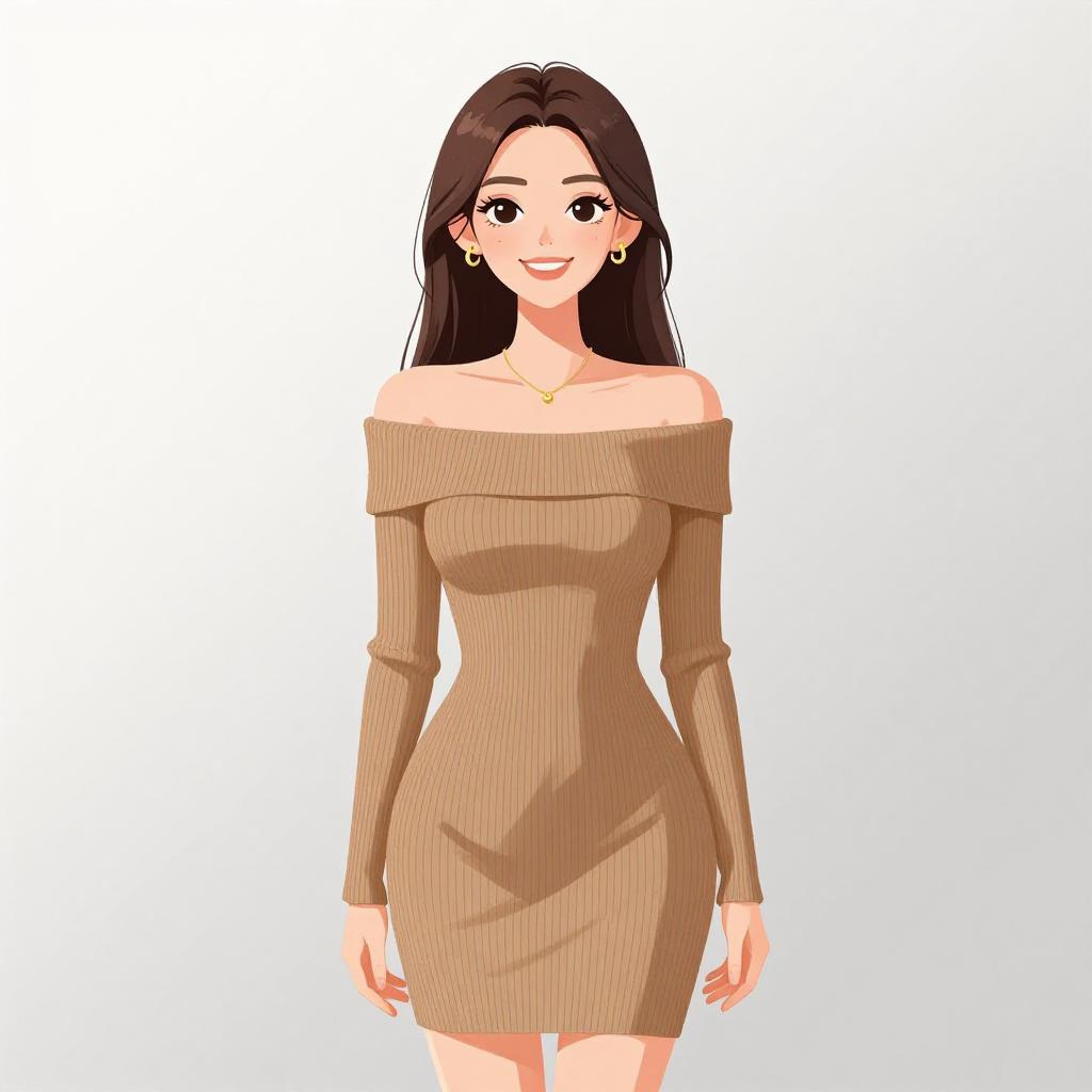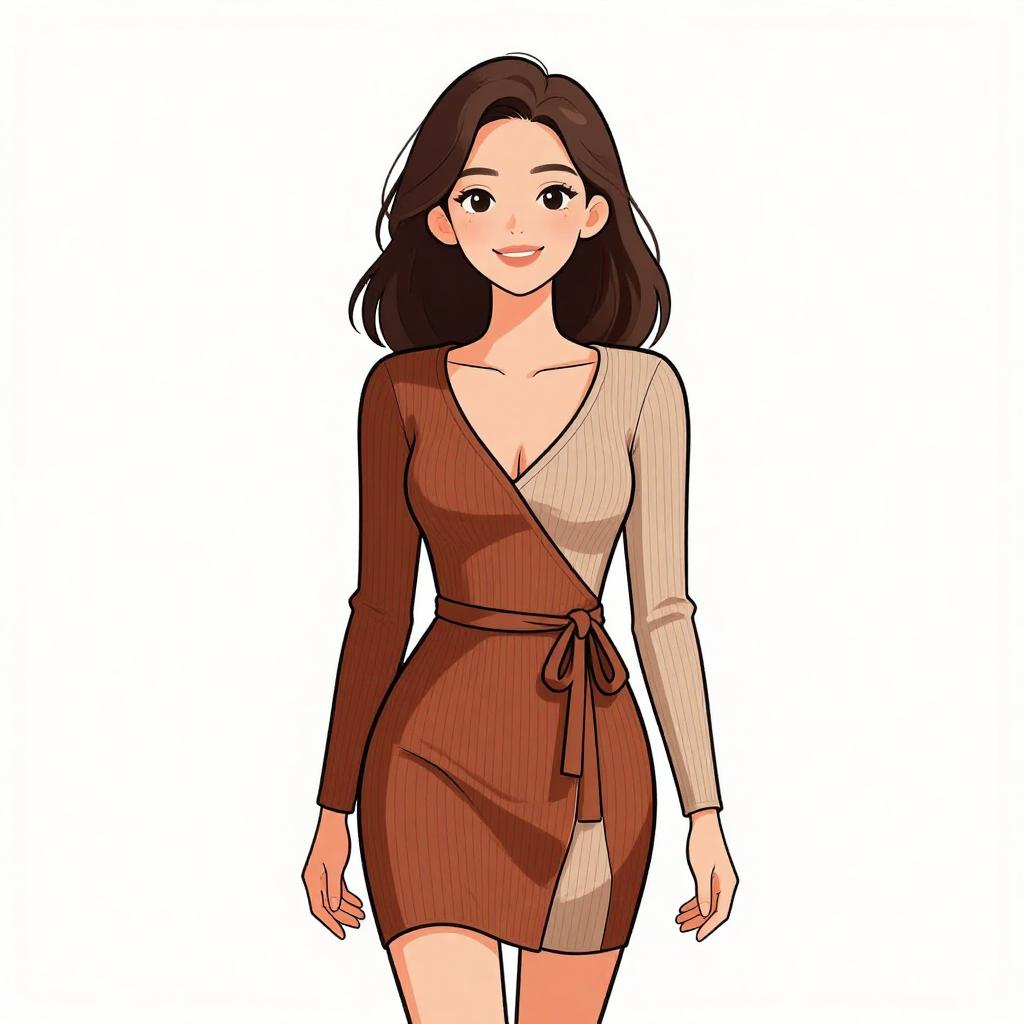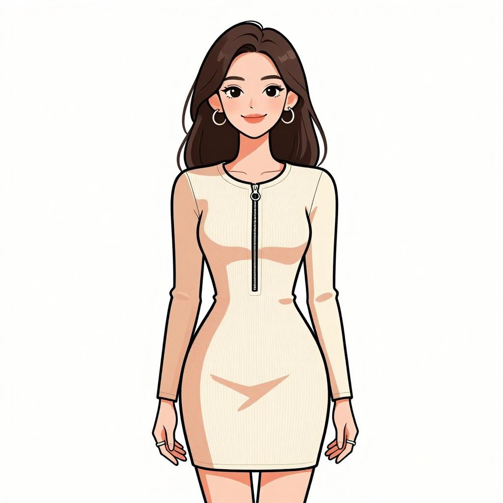 Woman with pretty face and pretty hair. smiling Woman, contemporary chic, color block mini dress in cream and peach tones, round neckline, long sleeves, zipper front closure with circular pull, fitted silhouette, ribbed texture, thigh-length hem, minimal jewelry with rings, white studio background. --sref 1467