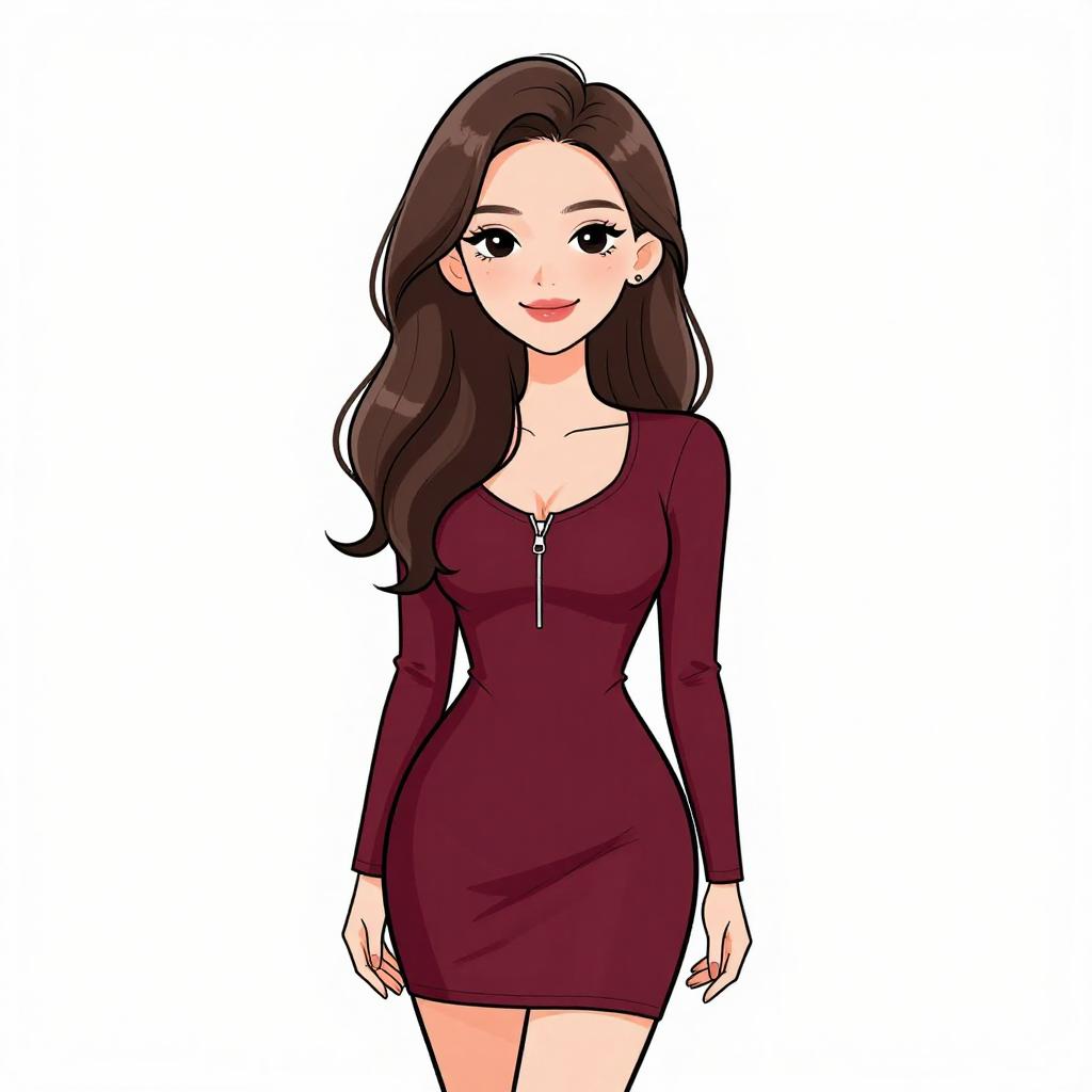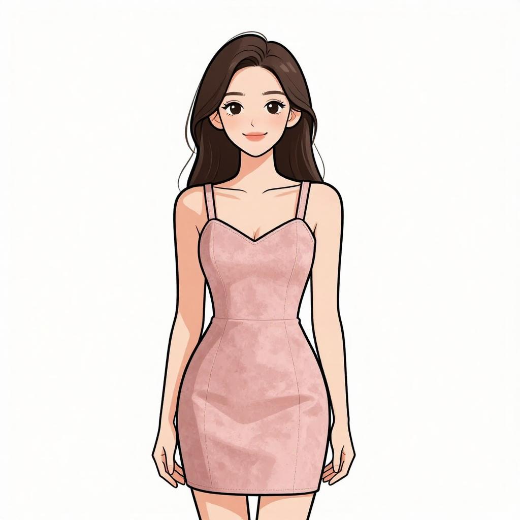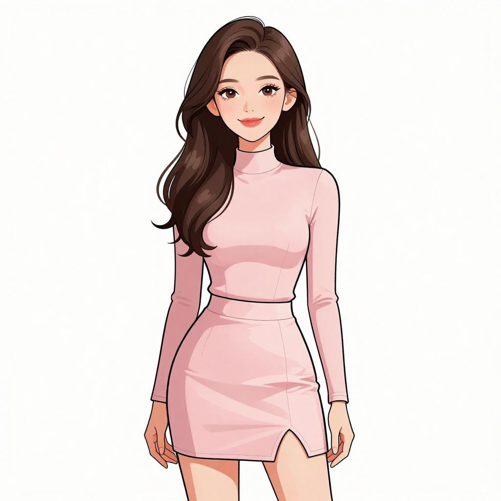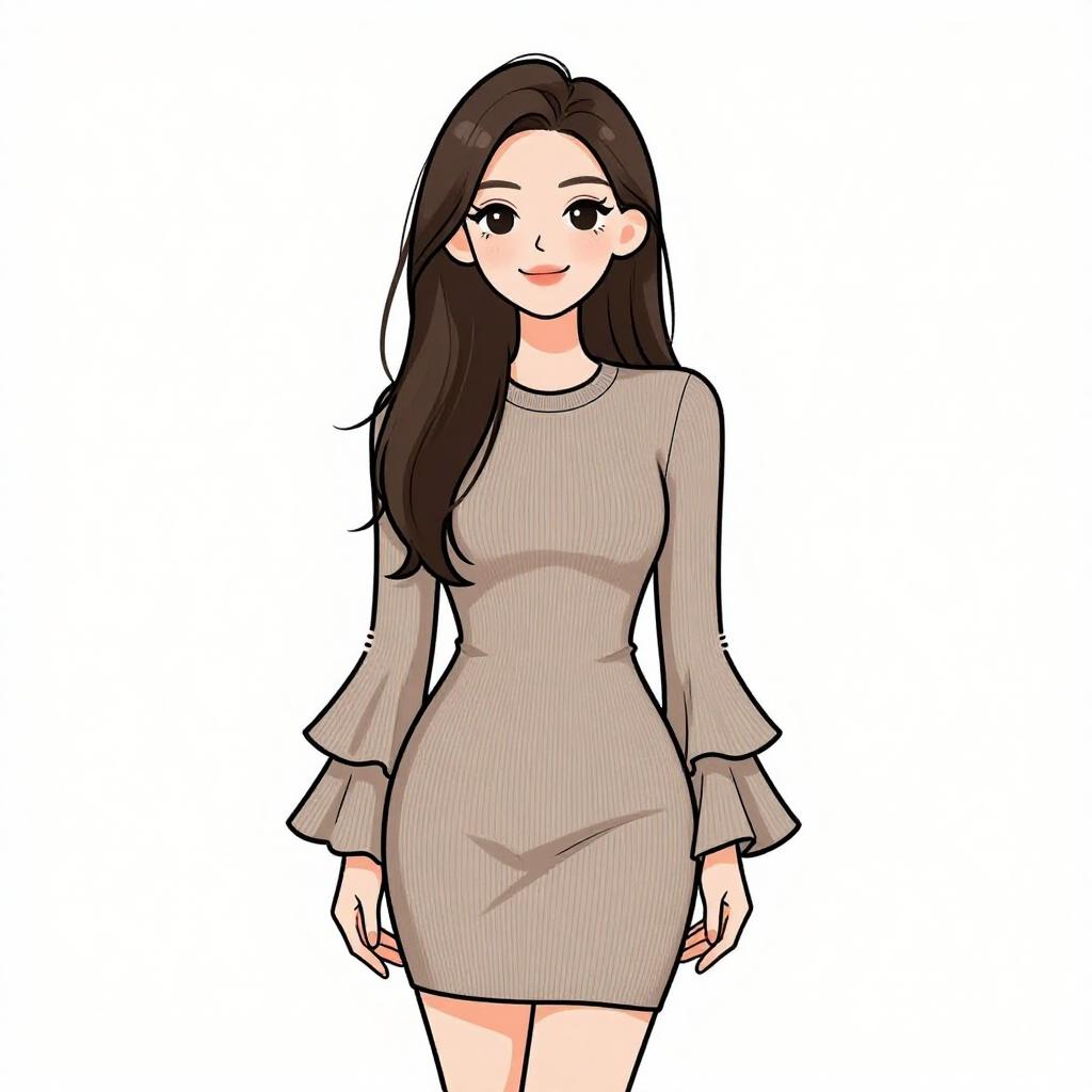 Woman with pretty face and pretty hair. smiling Woman, contemporary chic, color block mini dress in cream and peach tones, round neckline, long sleeves, zipper front closure with circular pull, fitted silhouette, ribbed texture, thigh-length hem, minimal jewelry with rings, white studio background. --sref 1467