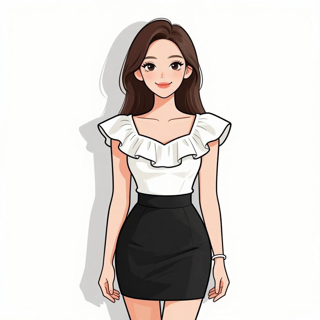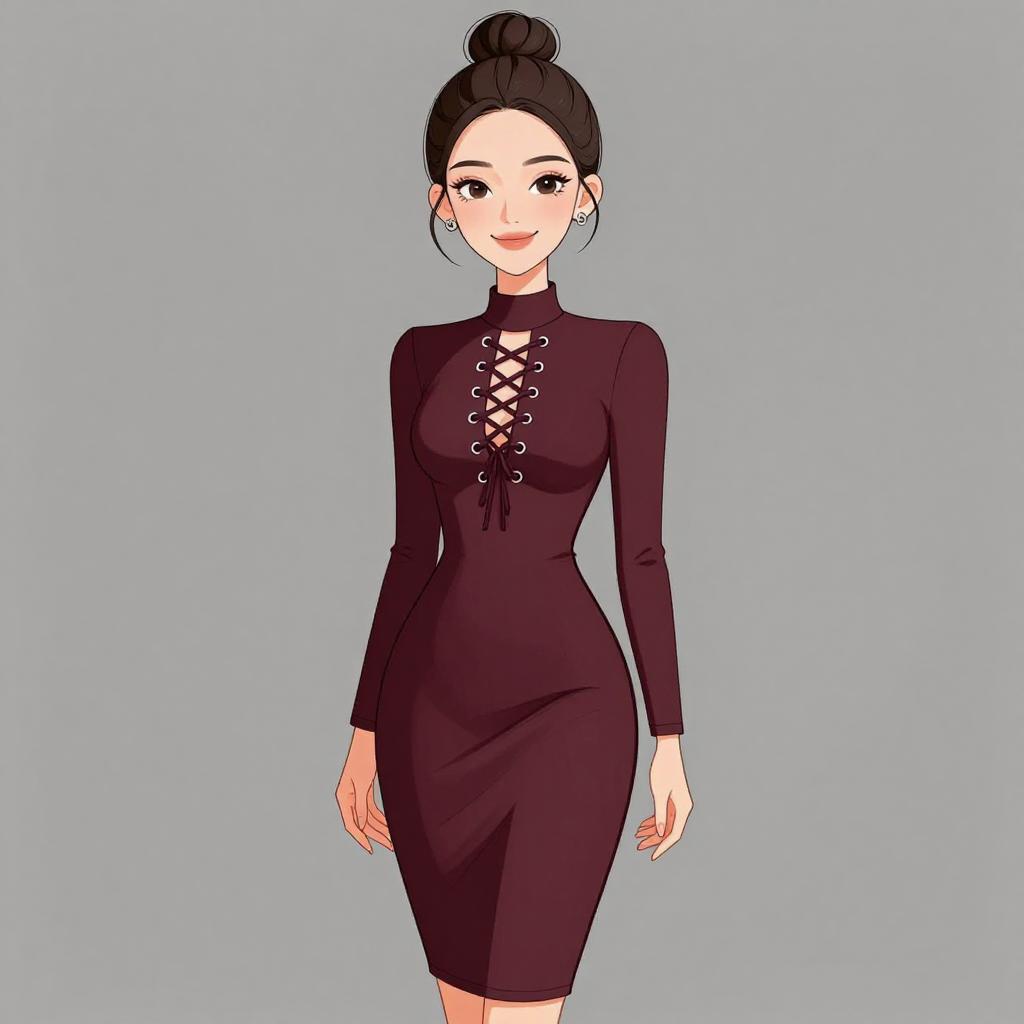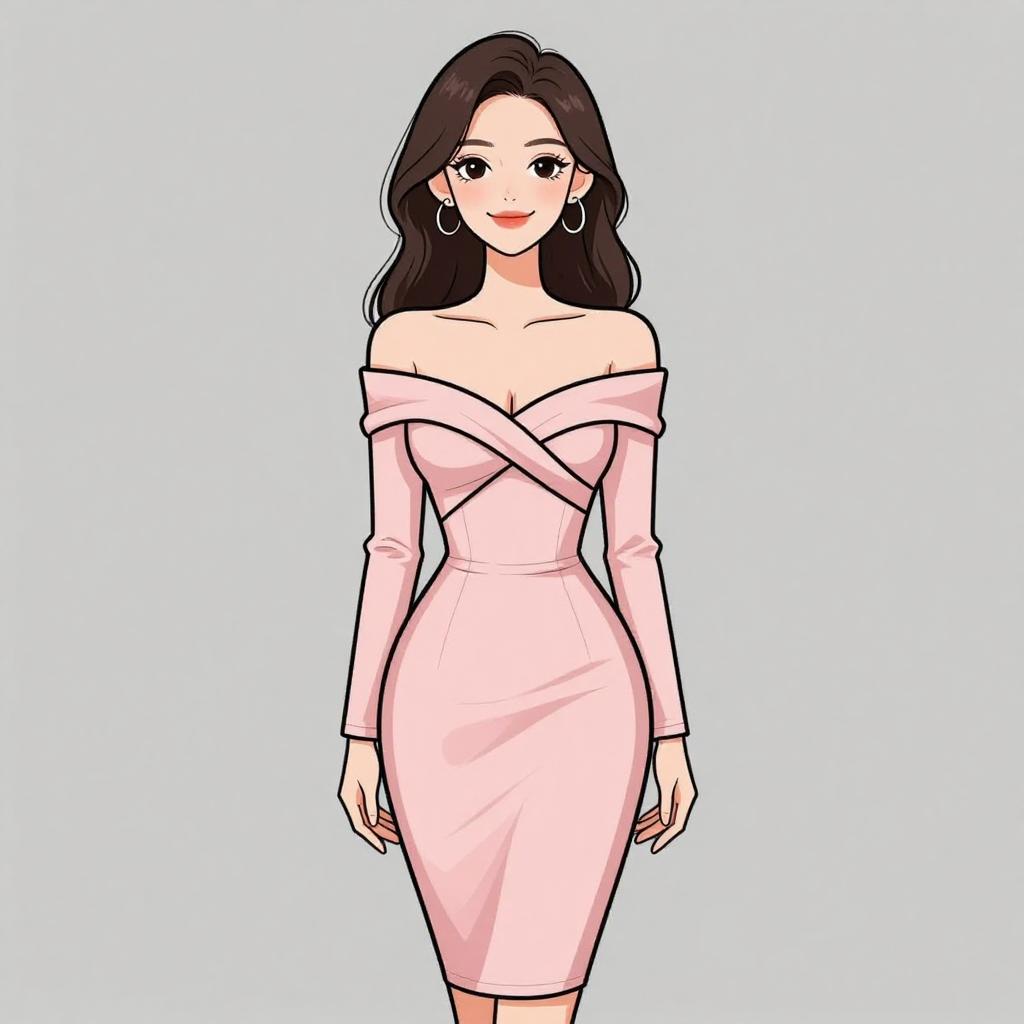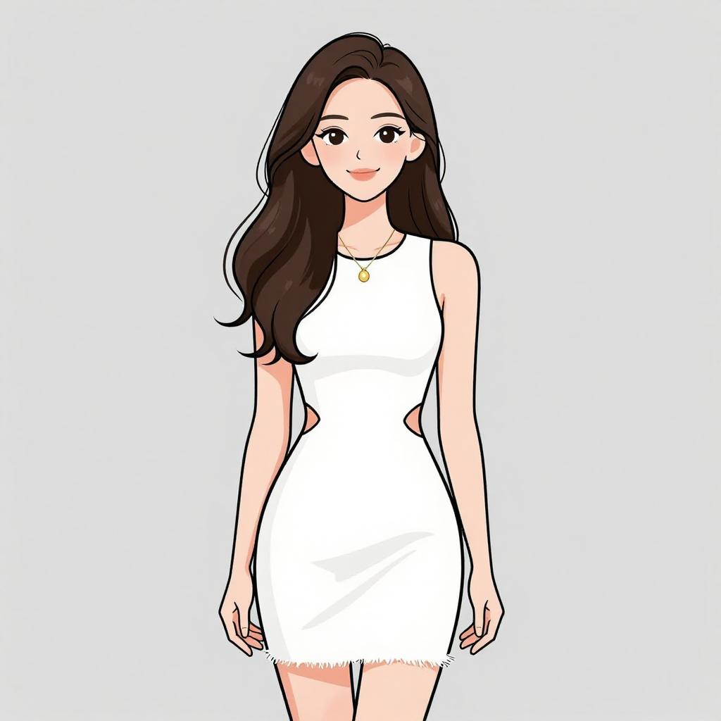 Woman with pretty face and pretty hair. smiling Woman, contemporary chic, color block mini dress in cream and peach tones, round neckline, long sleeves, zipper front closure with circular pull, fitted silhouette, ribbed texture, thigh-length hem, minimal jewelry with rings, white studio background. --sref 1467