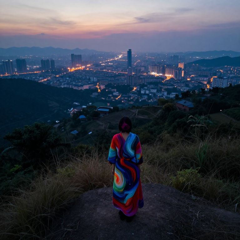 A captivating portrait depicting an enigmatic figure standing alone at twilight, viewed from a unique aerial perspective, showcases a harmonious blend of natural and urban elements. The subject, dressed in vibrant garments reminiscent of swirling brushstrokes, stands amidst a cityscape now bathed in an ethereal glow. This surreal convergence captures both the tranquility of a vanishing rural world and the dynamic energy of modernity, creating an emotional gradient that is visually striking and harmonious.