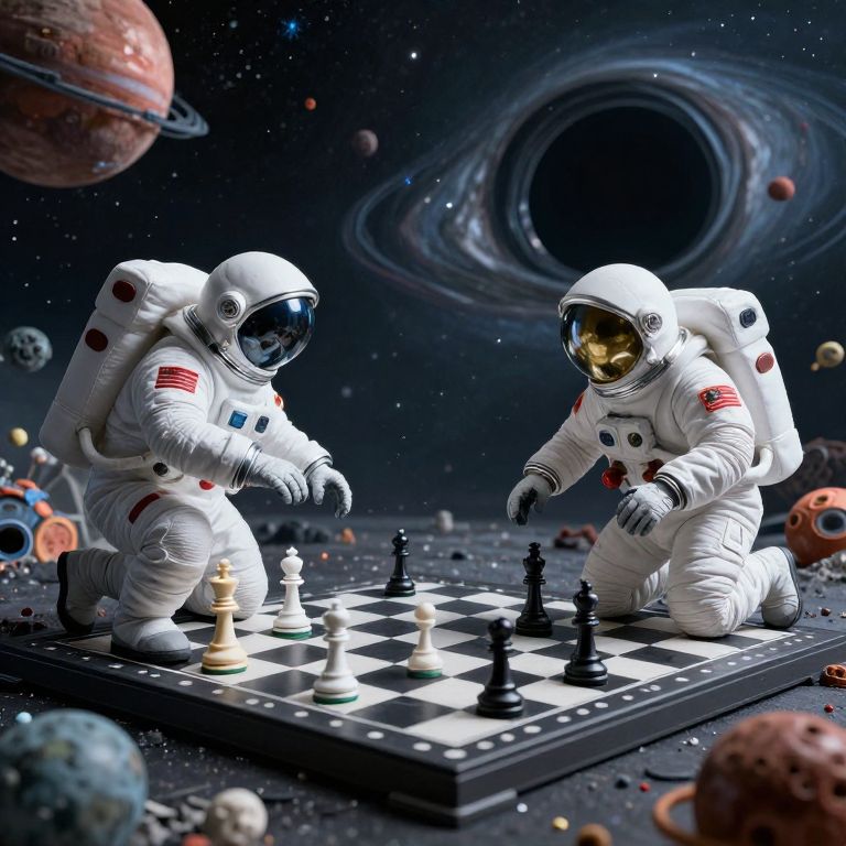 Two astronauts in retro-style spacesuits engage in a cosmic chess match on a checkered board, surrounded by surreal celestial bodies and a massive black hole, evoking a blend of science fiction and fantasy in a high-definition, digitally rendered scene.