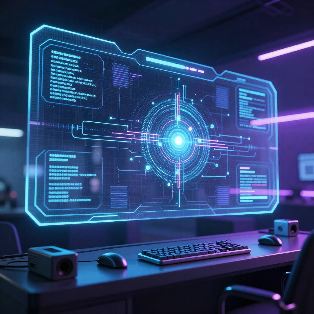 AI plan generator futuristic interface, glowing holographic screens displaying complex data flows, neon-lit digital control room with high-tech gadgets, sleek modern design, cyberpunk aesthetic, intricate algorithm visualizations, vibrant blue and purple tones