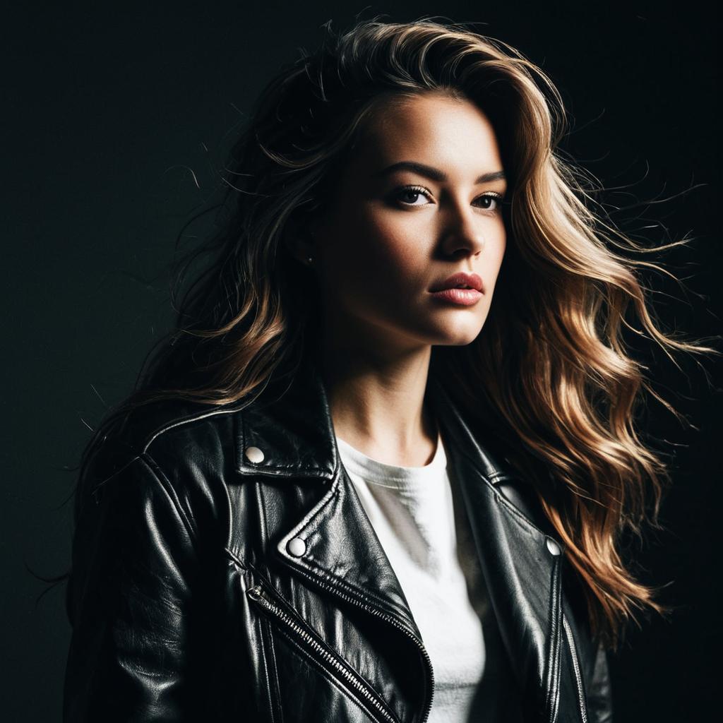 Long and Flowing hairstyle on woman, wearing vintage leather jacket, in studio, captured in fashion editorial style with dramatic spotlight.