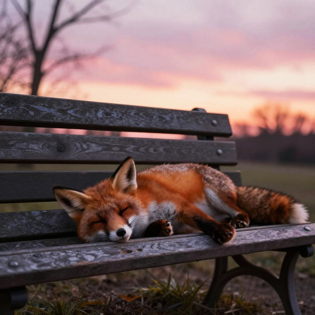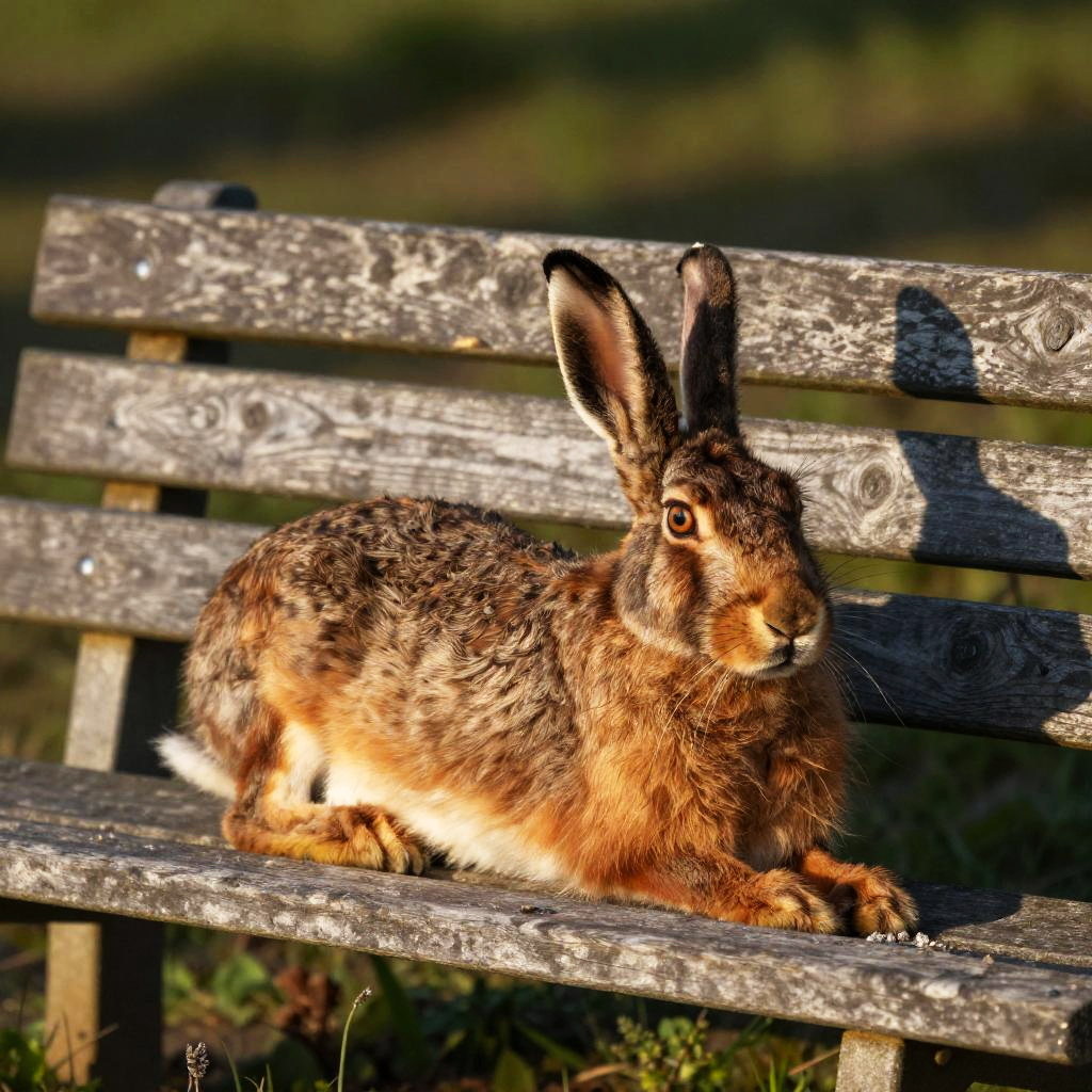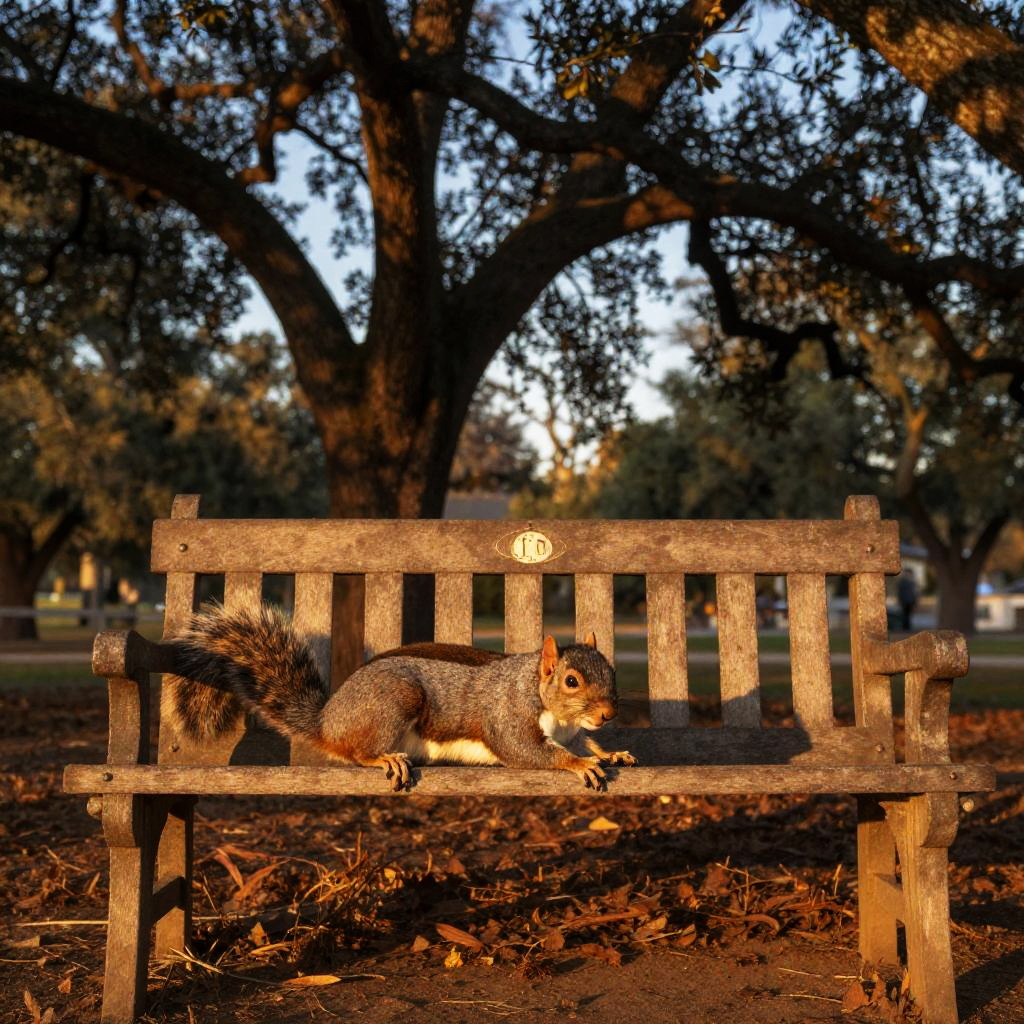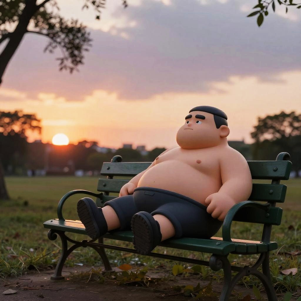 Big chungus on a rustic iron park bench watching the warm orange sunset