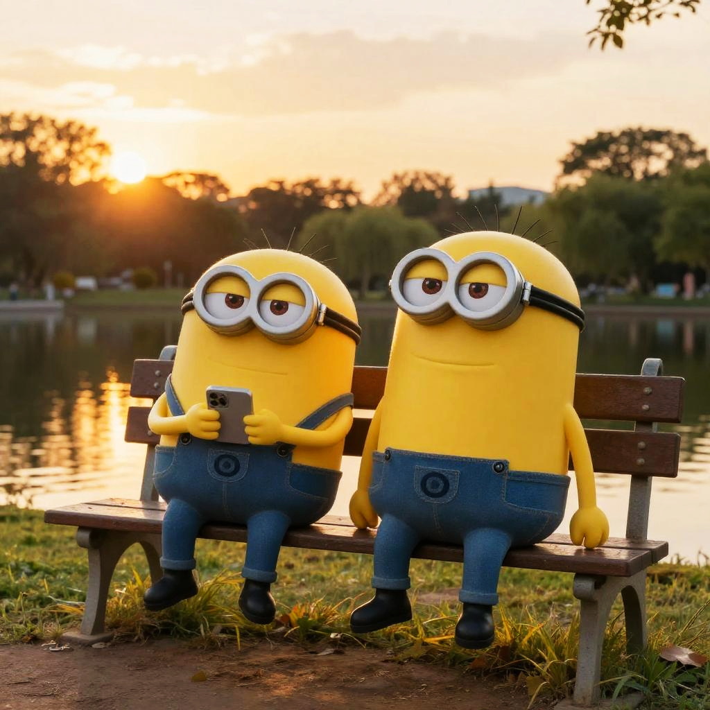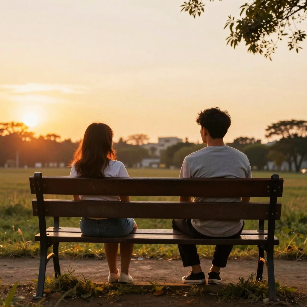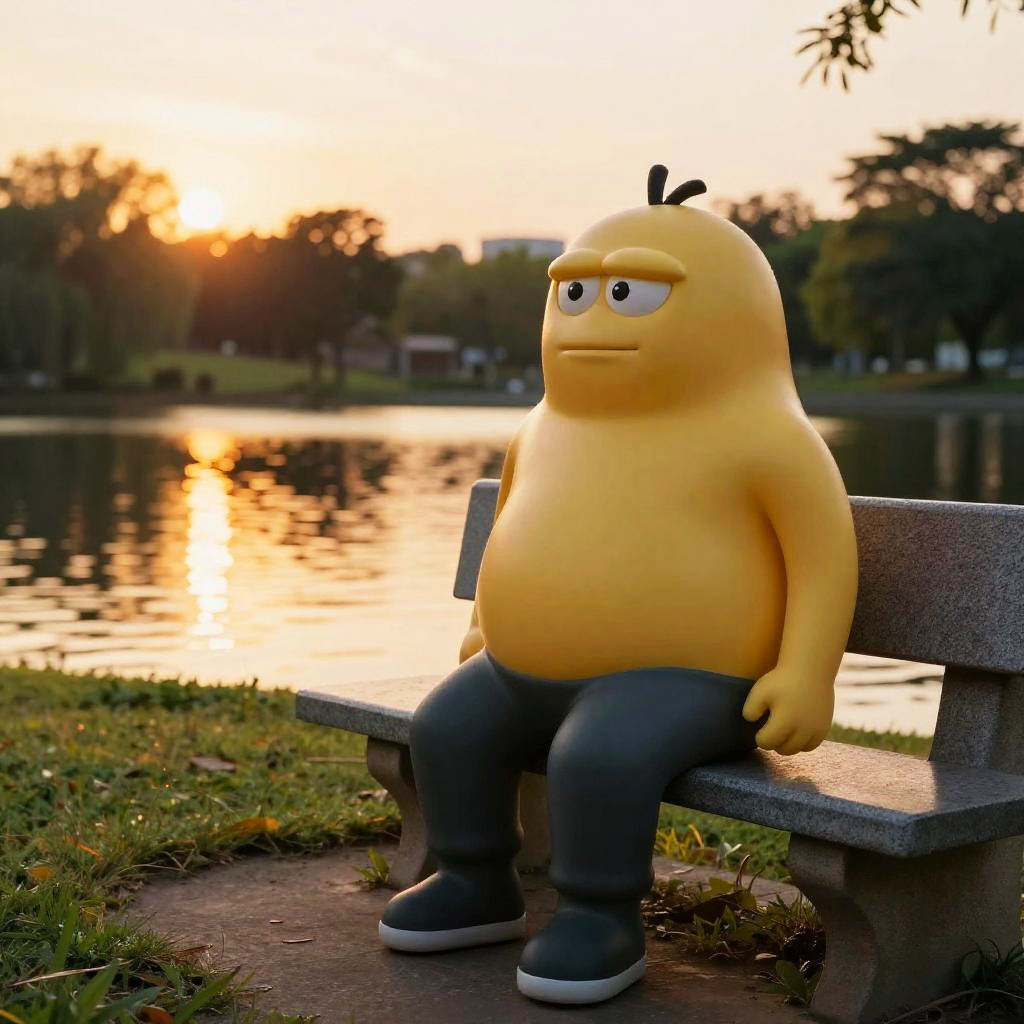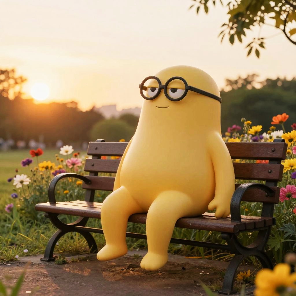 Big chungus on a rustic iron park bench watching the warm orange sunset