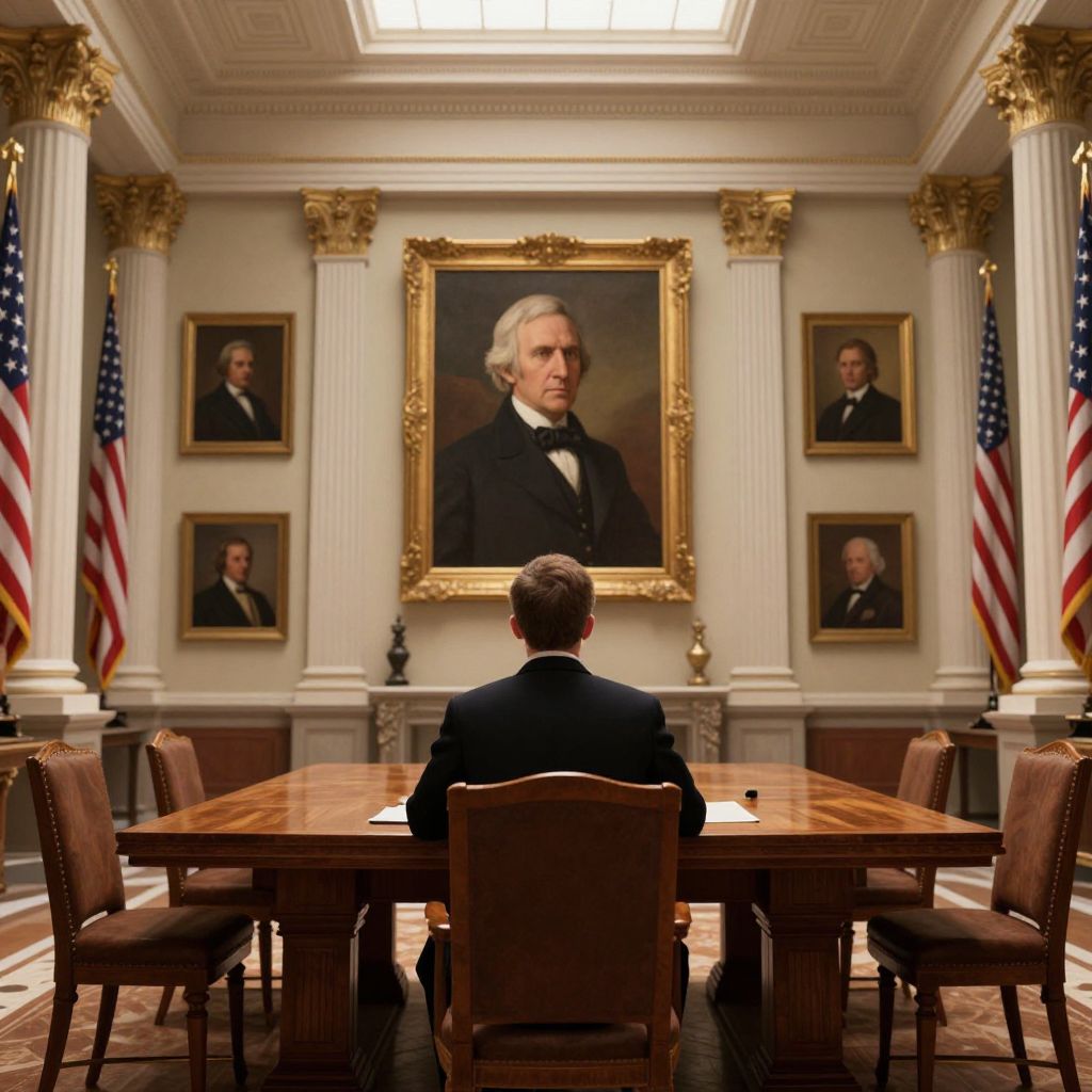 In this soft, realistic digital art piece, a man sits at a large, polished wooden table, his back to the viewer, as he observes a momentous event in history. The scene is set in a grand, stately room with tall, ornate columns and a high ceiling, evoking a sense of grandeur and importance. The walls are adorned with framed portraits and American flags, adding to the historical ambiance. A large painting of a man with white hair and a stern expression hangs prominently on the wall, his gaze directed towards the viewer, creating a focal point in the room. The lighting is warm and soft, casting gentle shadows and highlighting the textures of the wooden table and the man's clothing. The overall composition is balanced, with the man's figure positioned centrally, drawing the viewer's attention to the historical moment being observed. The scene is imbued with a sense of reverence and solemnity, capturing a moment of reflection and contemplation.