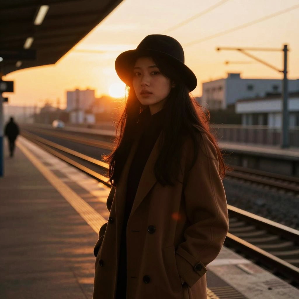 Photograph of an Asian woman in a brown coat and black hat, standing on a sunlit train platform with golden sunset.