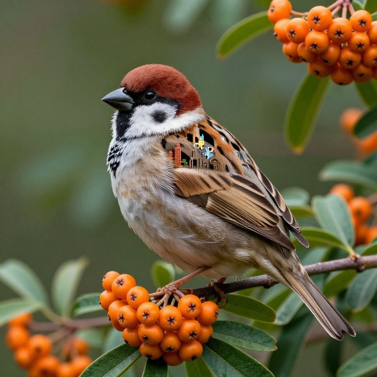 Enormous clockwork sparrow perched amidst nature, its hollowed body revealing intricate miniature mechanical cities within, surrounded by vibrant orange berries and lush green foliage.