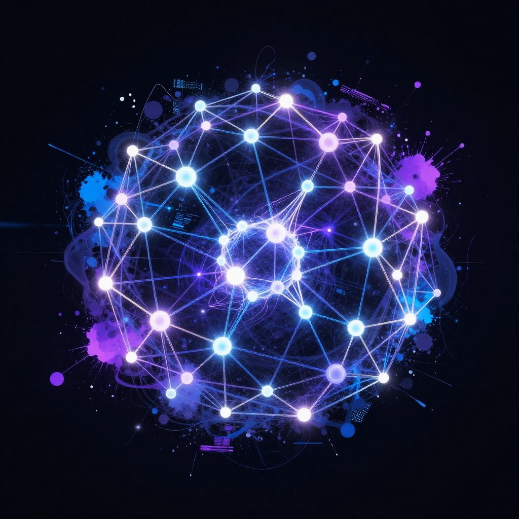 Digital artwork of a glowing, interconnected network of white and purple lights against a dark blue and black background.