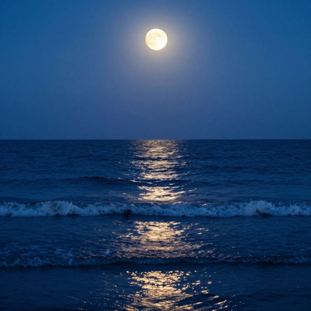Dramatic nighttime moon reflection on ocean, strong contrast of silver light and deep blue water, textured waves under glowing moon, cinematic and captivating mood