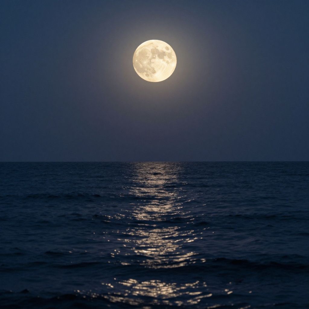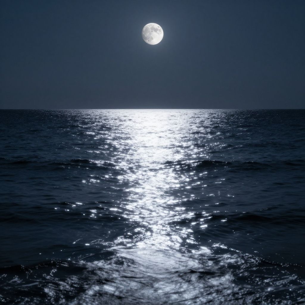 Photograph of a dark, midnight ocean under a bright, full moon. The moon's white light creates a shimmering, silver path across the rippling, deep blue water. The horizon is barely visible, blending into the dark sky. The image captures the serene and tranquil atmosphere of a night sea, with the moon's reflection adding a sense of depth and movement to the water's surface. The overall color palette is dominated by deep blues and silvers, enhancing the nocturnal, peaceful ambiance.