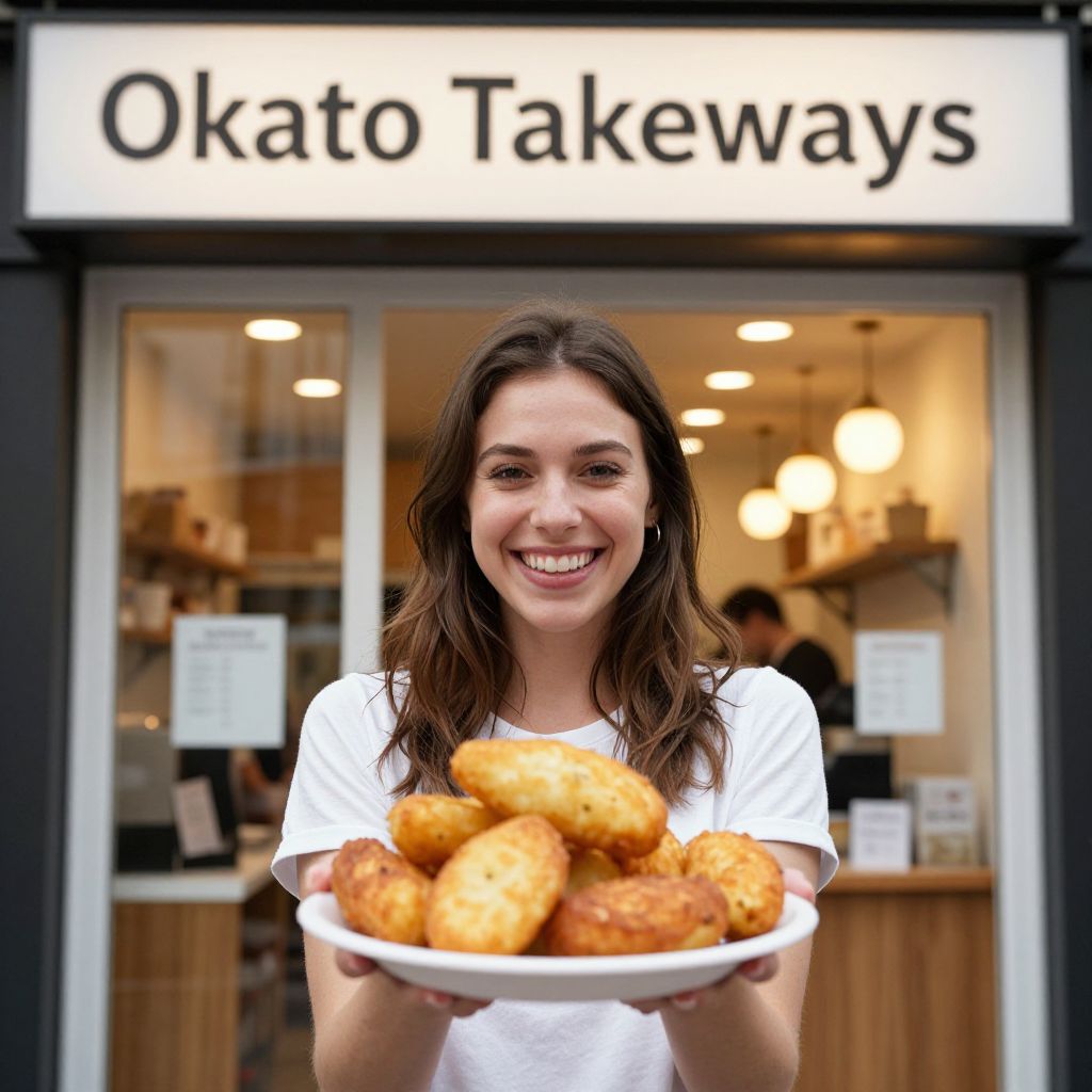 Woman smiling brightly while holding a plate of golden-brown potato fritters in front of the Okato Takeaways shop, showcasing its inviting entrance with warm interior lighting and signage above.