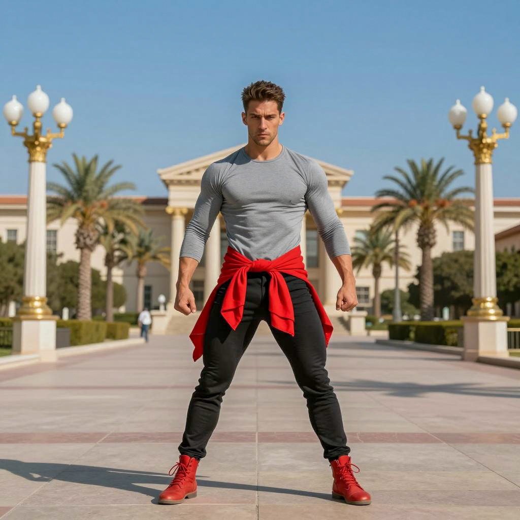 Contemporary dance costume, photograph of a muscular man, standing in the center of a paved courtyard, wearing a tight gray long-sleeve shirt, black pants, red shoes, and a red scarf tied around his waist, blue sky background, classical building in the distance, palm trees, ornate golden pillars with white lanterns on both sides, bright daylight, realistic, high detail, action hero style, confident pose, intense expression, sunny weather