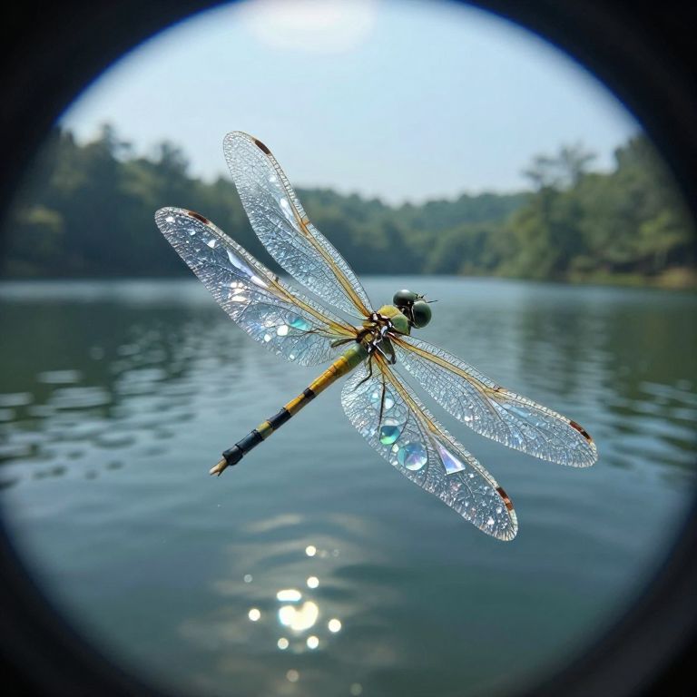 Photograph of a vibrant dragonfly with iridescent wings hovering above a sunlit forest pond, surrounded by lush greenery and lily pads.