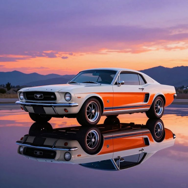 A car standing on a perfectly smooth surface that reflects it, creating a mirror effect, The 1960s ford mustang is done in a bright style with an emphasis on white and orange and blue hues, a futuristic atmosphere, The background shows a sunset with soft purple and orange colors and silhouettes of mountains