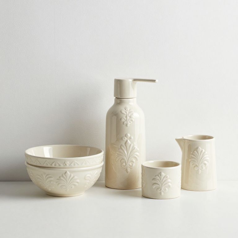 Furla cream damask ceramic bath accessories for Bathroom pieces