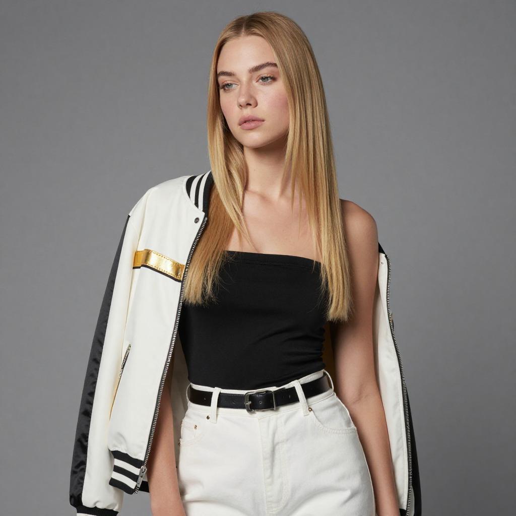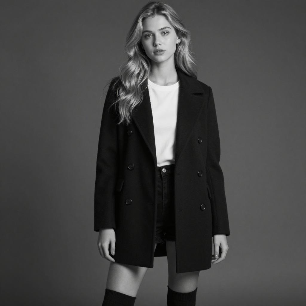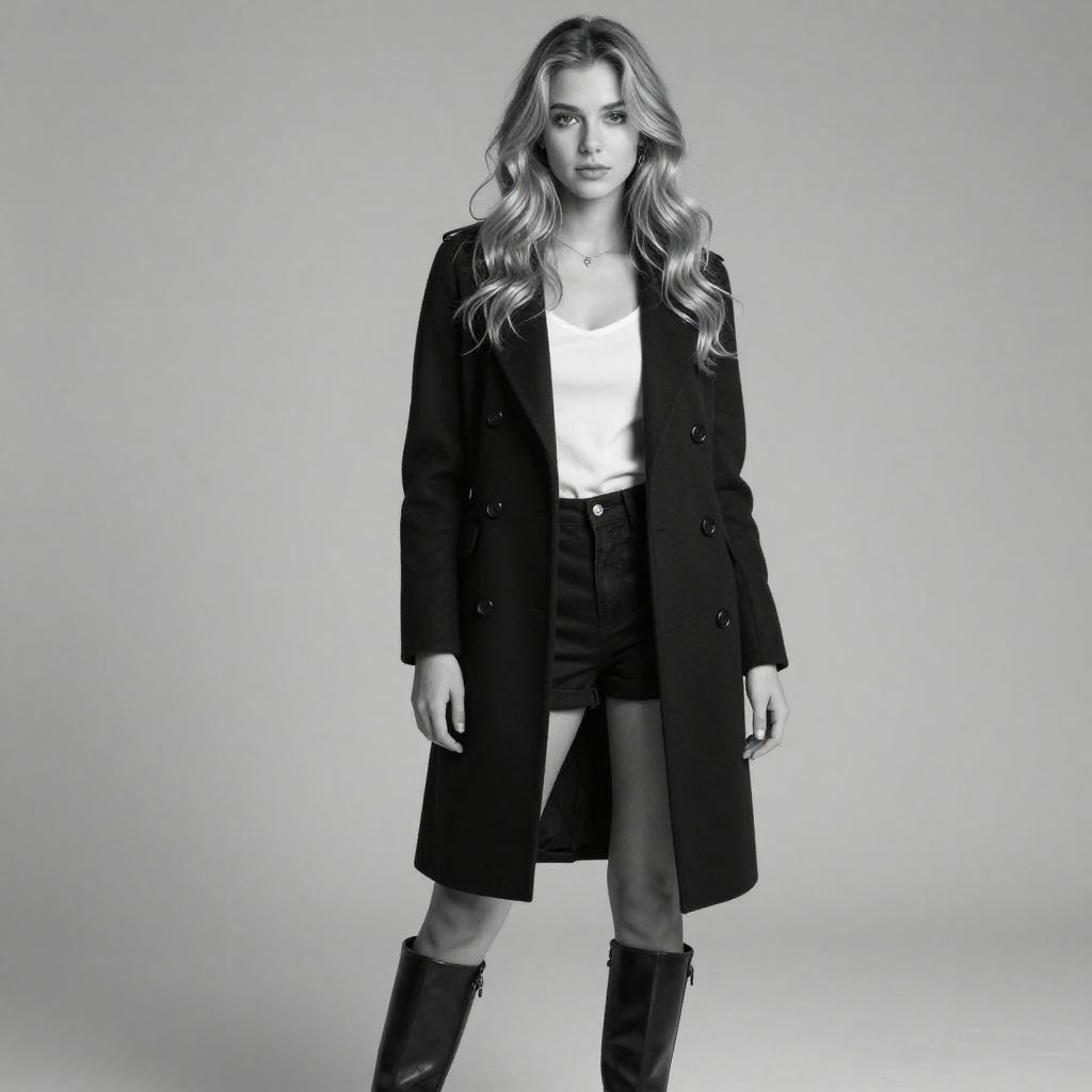 Black-and-white photograph of a young woman with long, wavy blonde hair, wearing a black coat over a white top, black shorts, and knee-high boots. She stands against a plain gray background, looking directly at the camera with a neutral expression. Her left hand rests by her side, and her right hand is slightly raised.