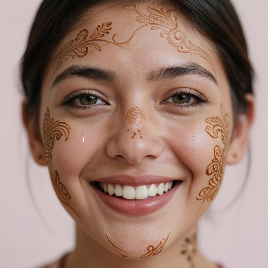Photograph of a young woman with light brown skin and dark brown eyes, smiling widely. Her face is adorned with intricate, brown henna patterns on her forehead, cheeks, and chin. She has dark, straight hair pulled back, and her teeth are white and straight. The background is a soft, blurred white, focusing attention on her face. Her makeup is minimal, highlighting her natural beauty, with a subtle hint of blush on her cheeks. The henna patterns are symmetrical and ornate, adding an elegant, cultural touch to her appearance.