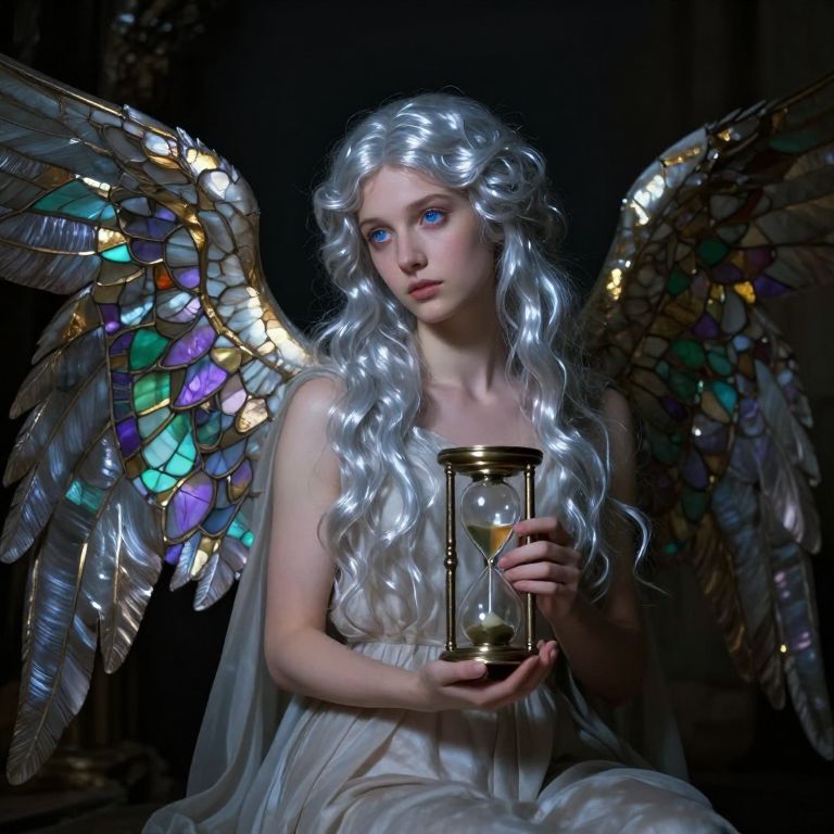 An enchanting portrait captures a celestial being with shimmering silver hair and captivating blue eyes, reminiscent of Caravaggio's \"Taking Jesus Down from the Cross.\" The subject sits in a dramatic setting where a partially lit background fades into darkness, emphasizing her luminous presence. Chiaroscuro lighting techniques illuminate delicate wings unfolding behind her, adorned with intricate patterns resembling stained glass in soft hues of purple, green, and gold. In this tender moment, she cradles an antique hourglass, symbolizing the fleeting nature of time while evoking a sense of wistful longing and profound introspection.