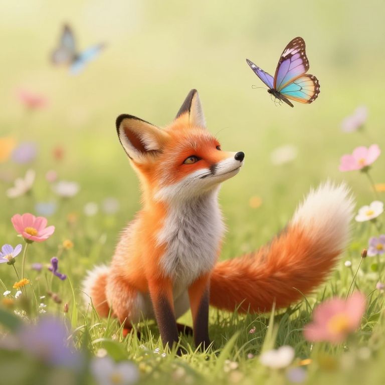 Eeve, a small agile creature with bushy tail and alert ears, sitting on a moss-covered rock near a shimmering waterfall, surrounded by colorful flowers and magical butterflies, watercolor painting style, serene atmosphere