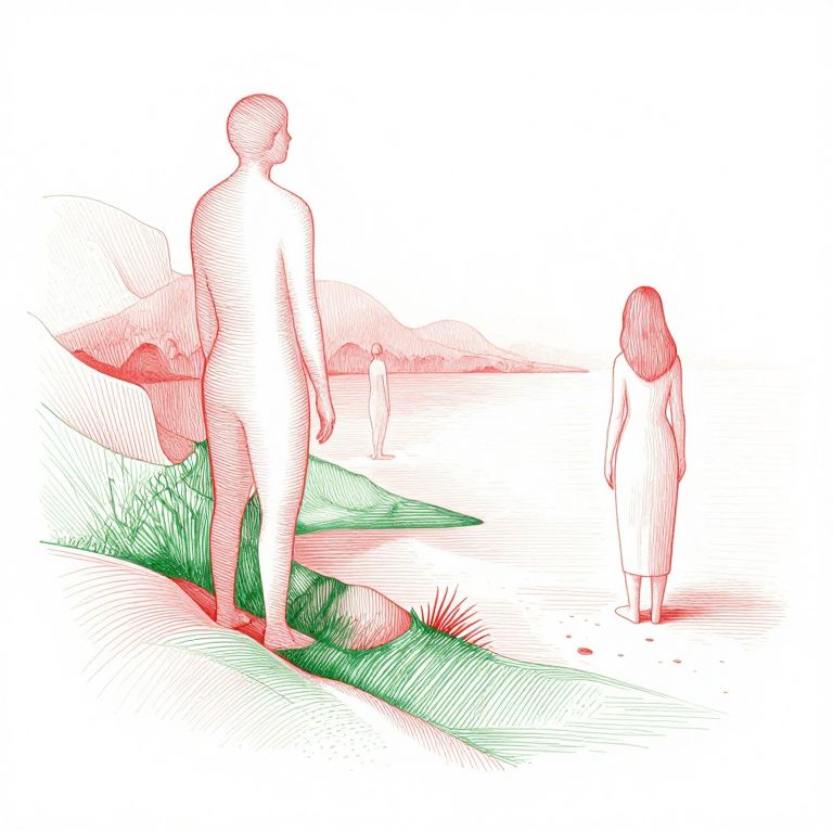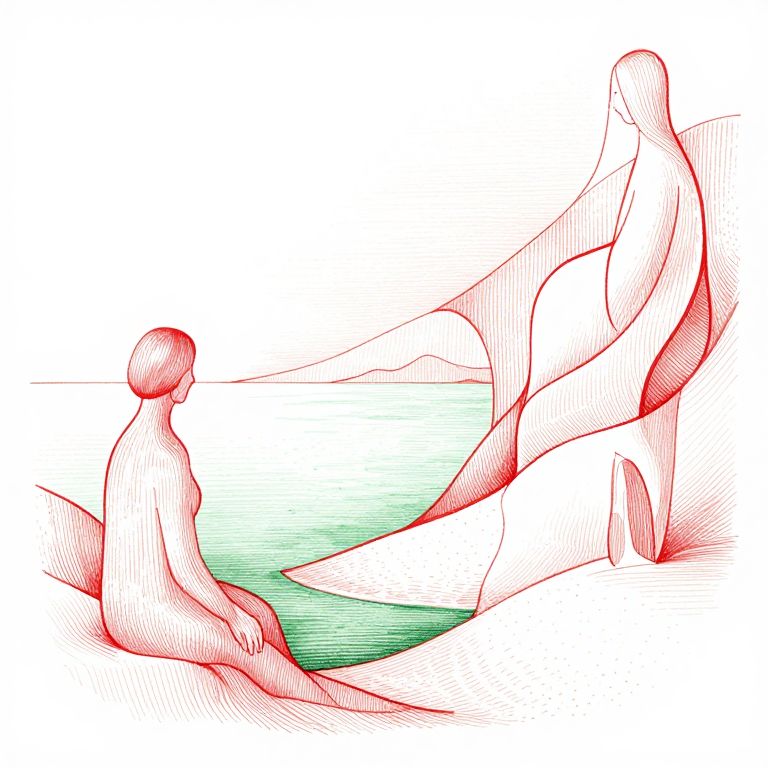 A minimalist, bichromatic red green, abstract hand-drawn style using only clean, organic shapes to create structure and definition, [An image with intricate cross-hatching, dense linework, and stippling for rich textures and shading, Incorporate smooth, organic details like fog and coastal, arranged with deliberate precision to convey realism and control, ], The rendering relies on bright, open spaces and crisp whites, avoiding deep shadows, for a polished, weightless aesthetic, Figures and forms are softened, natural, and delicate, enhancing a serene, harmonious tone, The careful balance of light line weight and gentle gradients removes visual tension, resulting in a calm, atmospheric composition with an odd, quiet charm