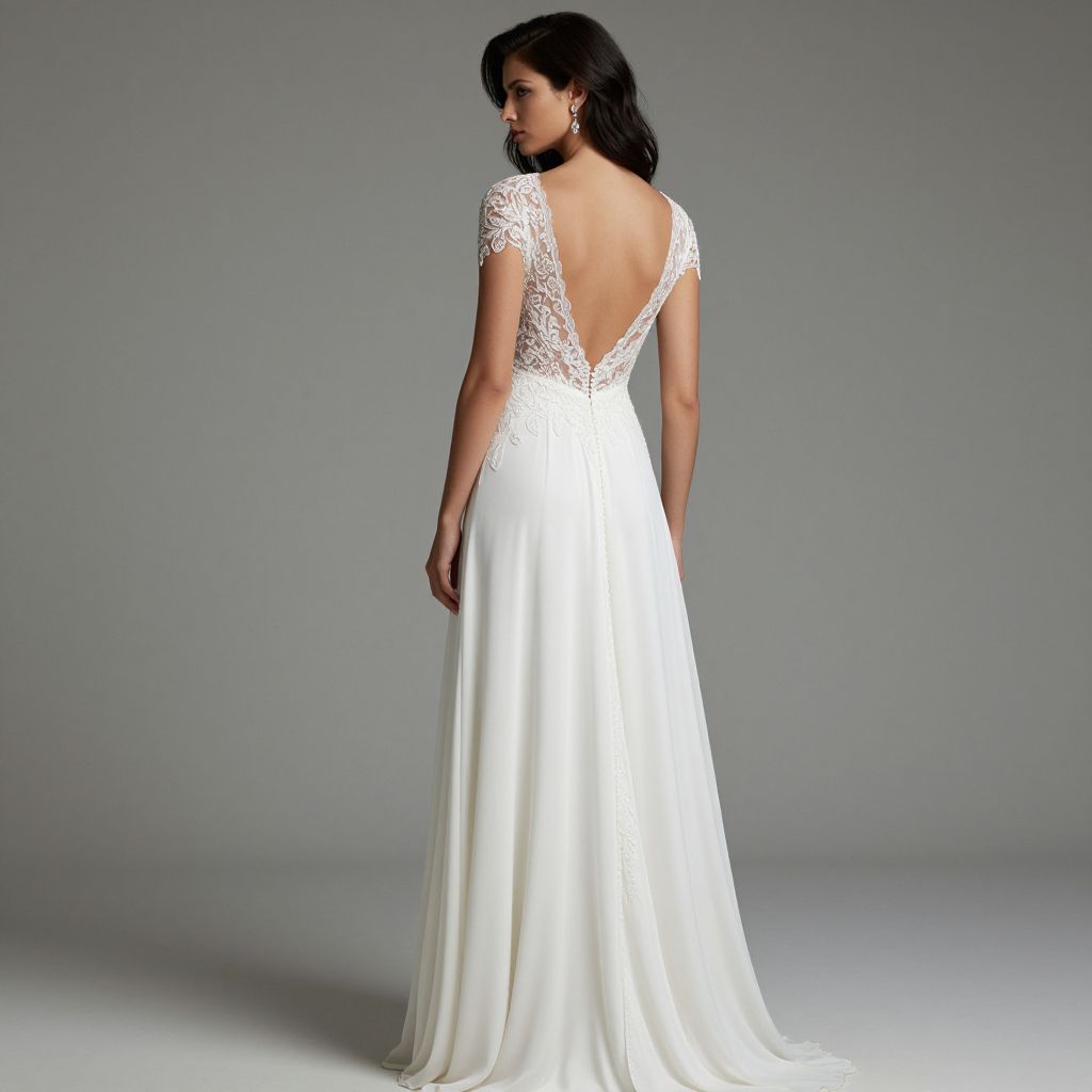 Fit-and-flare Casablanca wedding dress elegantly showcasing intricate lace detailing on the back, complemented by sheer sleeves and a flowing chiffon skirt, worn by a woman with cascading dark hair and sparkling diamond earrings against a neutral gray backdrop.