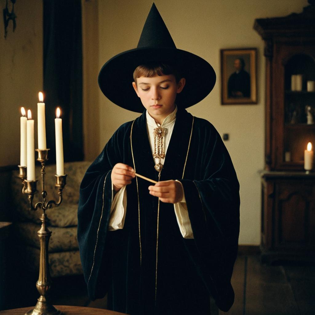 Portrait of a young boy wearing a vintage black witch costume with wide sleeves and intricate jewelry, standing indoors near a brass candlestick with lit candles. The boy wears a tall pointed hat and has a serious expression, holding a thin object in his hands in a softly lit room with traditional wooden furniture.