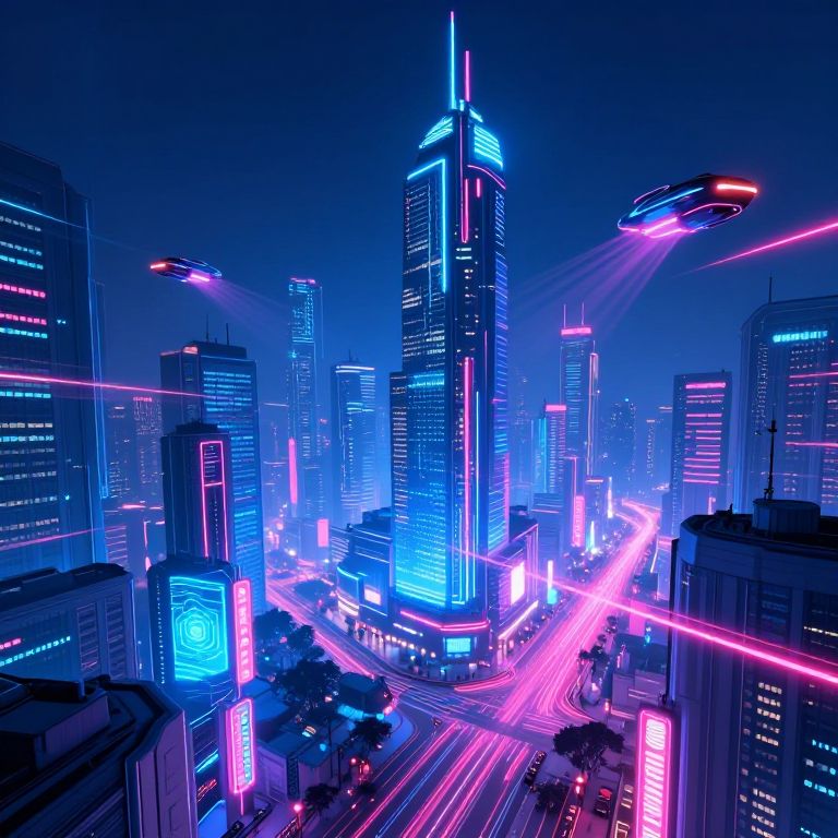 A vibrant cyberpunk city skyline illuminated by neon blue and pink lights, featuring towering skyscrapers with glowing architectural elements. Advanced technology is visible throughout, including flying vehicles casting colorful light trails and urban streets filled with neon signs and holograms, creating a futuristic metropolis atmosphere.