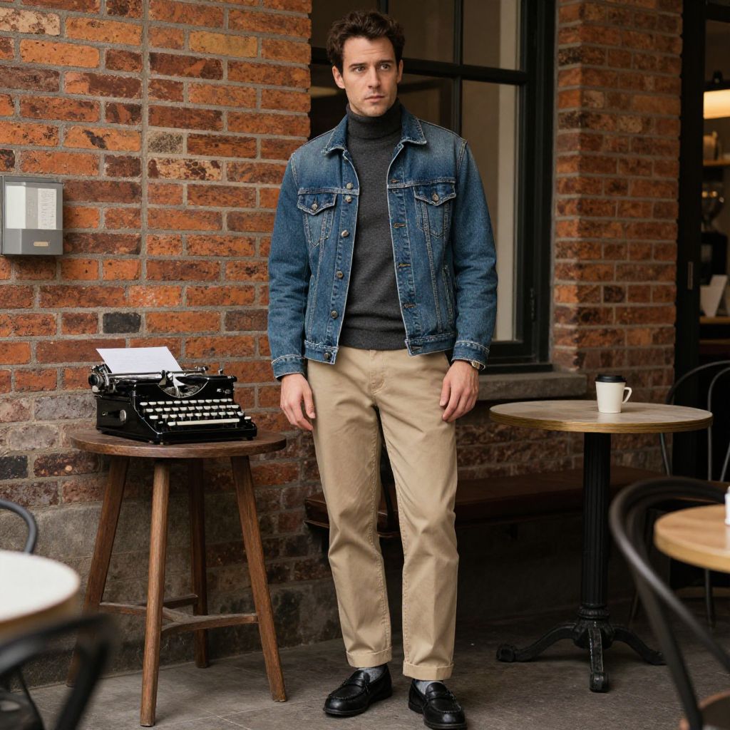 A man, classic urban explorer denim jacket, charcoal turtleneck, khaki chinos, black loafers, historic brick building, vintage typewriters, cozy coffee corner, cinecolor, thoughtful expression. Man has masculine face and piercing eyes