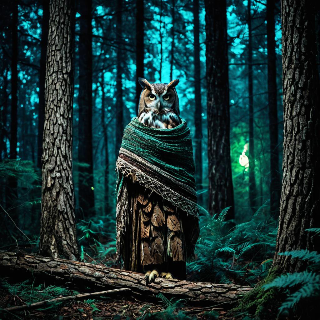 Forest healer draped in woven bark, in the forest at night with high trees, faint green bioluminescence, and an owl, colorful art