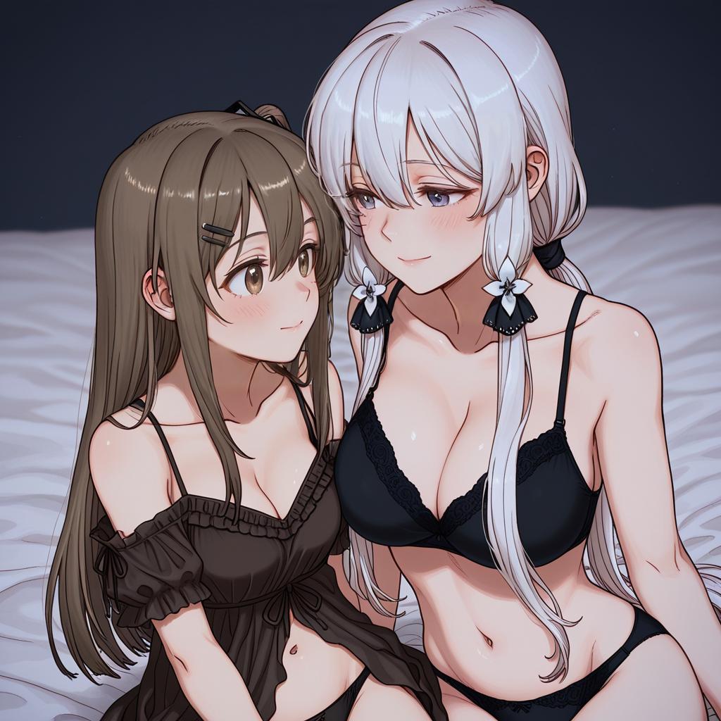 K2 (girls' frontline), girls' frontline, 1girl, brown eyes, hair between eyes, brown hair, long hair, sidelocks, hairclip, medium breasts, large breasts, cleavage, navel, collarbone, black panties, bare shoulders, one side up, by artist torinone, dark_illustrious